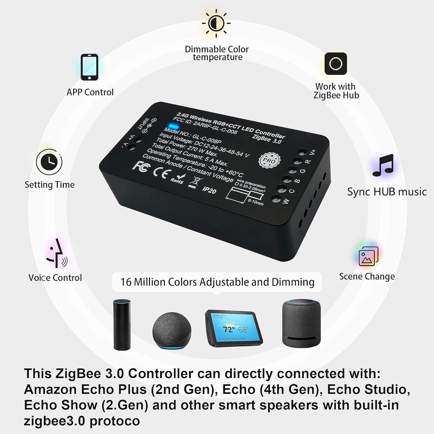 16 million multi Colors: ZigBee LED controller work with RGBW led strip/RGBWW LED strip light. Turn on/off zigbee led strip rgbcct,adjust the RGB WW CW color,temperature and dimming 1%~100%