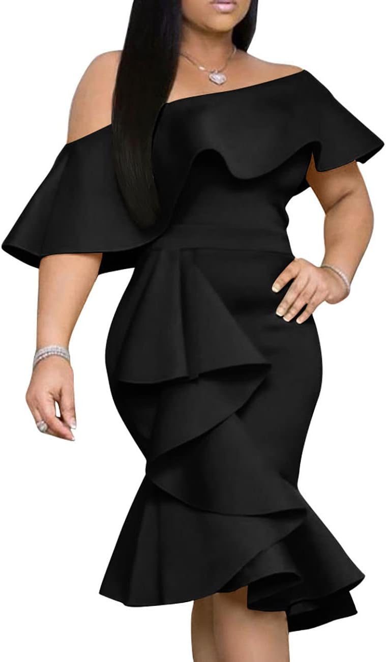 GOBLES Women's Elegant Off The Sholder Back Zipper Ruffles Bodycon Midi Cocktail Dress