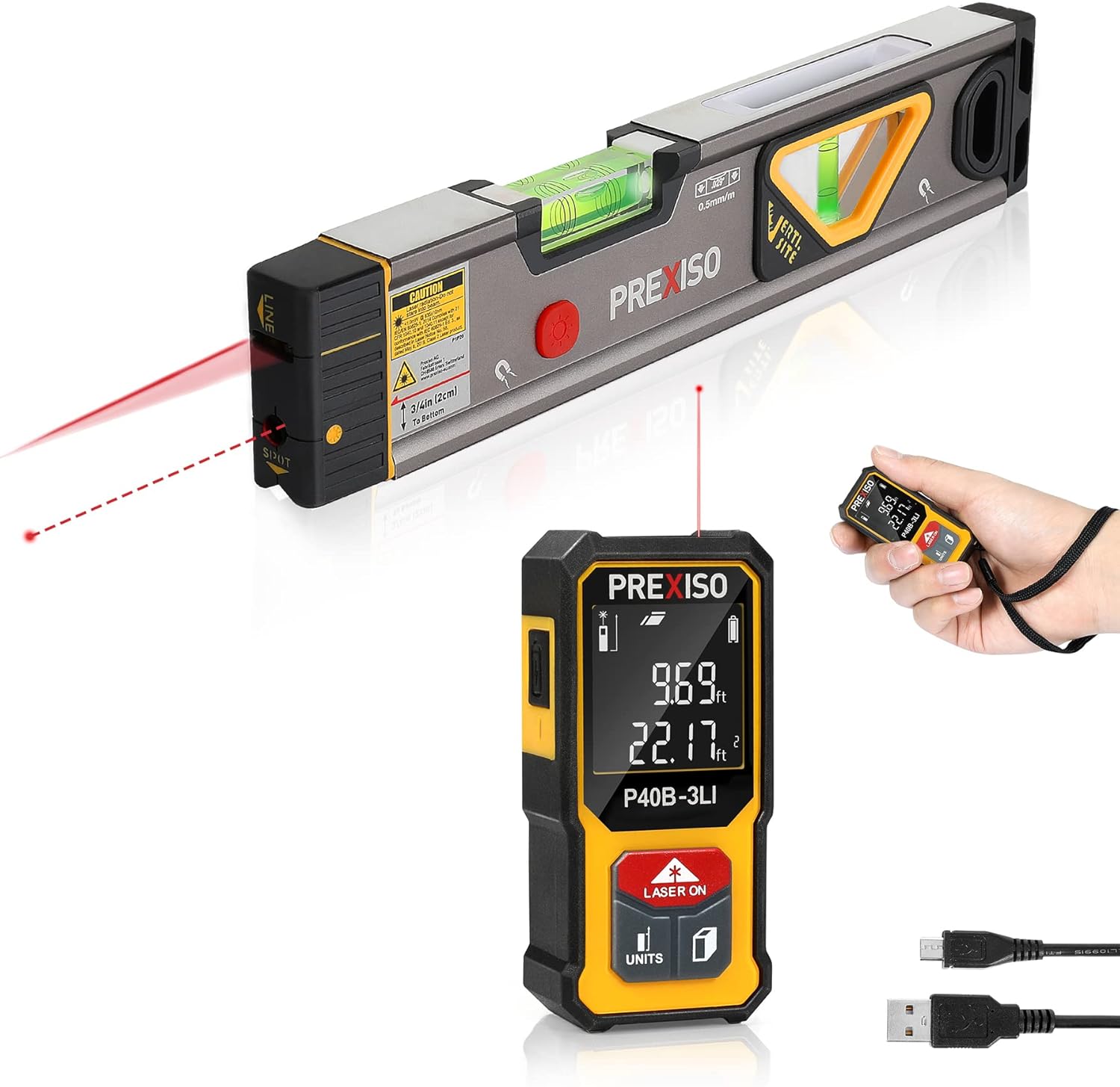 Package Contents: PREXISO 135Ft Mini Laser Measure Including - Mini Laser Measure; USB changing; User Manual; Hand Strap; PREXISO 2-in-1 Laser Level Spirit Level Including - laser level, 2 x 1.5V alkaline AAA; User Manual; Class 2 laser, maximum laser output less than 1mW