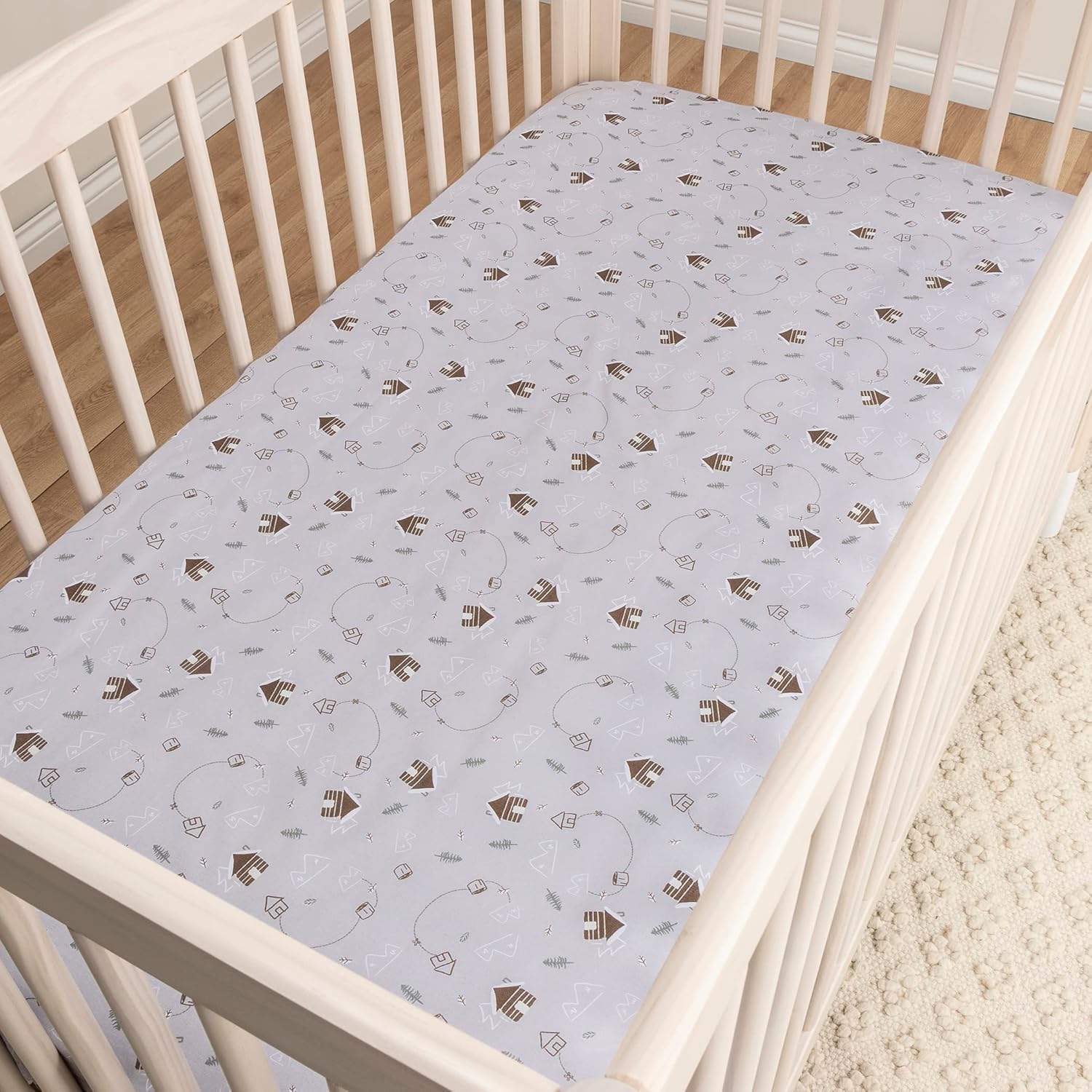 This set of 2 wonderful soft crib sheets includes a sketched cabin print featuring pine trees, wooden logs, leaves and trails in walnut brown, pale green and forest green on a glacier gray background