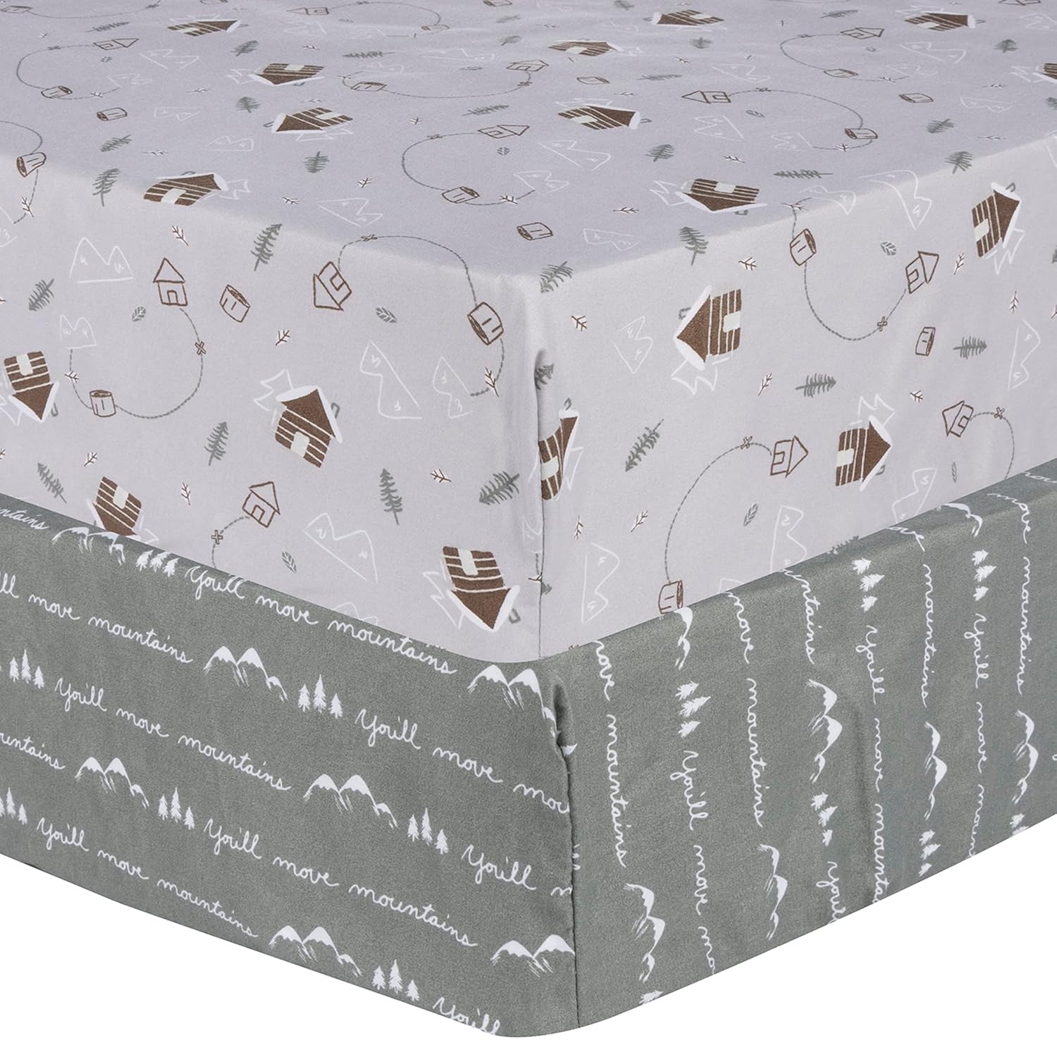 Get cozy with our Mountain Cabin 2-Pack Microfiber Fitted Crib Sheet Set by Sammy & Lou®. This set of 2 wonderful soft crib sheets includes a sketched cabin print featuring pine trees, wooden logs, leaves and trails in walnut brown, pale green and forest green on a glacier gray background. A coordinating sheet features a directional print of mountains, pine trees, and a script writing reading "you'll move mountains" in white on a forest green background. Crib sheets fit a standard 28 in x 52 in crib mattress with 8-inch-deep pockets and elastic surrounding the entire opening ensuring a more secure safer fit. Additional Sammy & Lou® bedding and accessories sold separately. Please adhere to JPMA’s Safe Infant Bedding Practices.