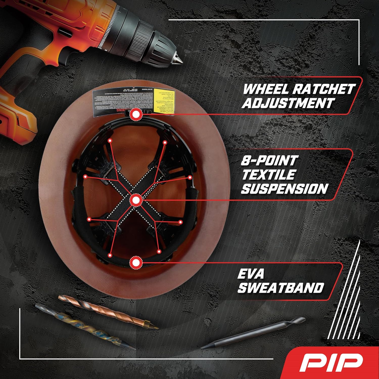 Comfort: the full brim hard hat features a smooth dome shape with exposed rivets and is designed with a soft, non-chafing, EVA moisture wicking management sweatband padding for maximum sweat absorption