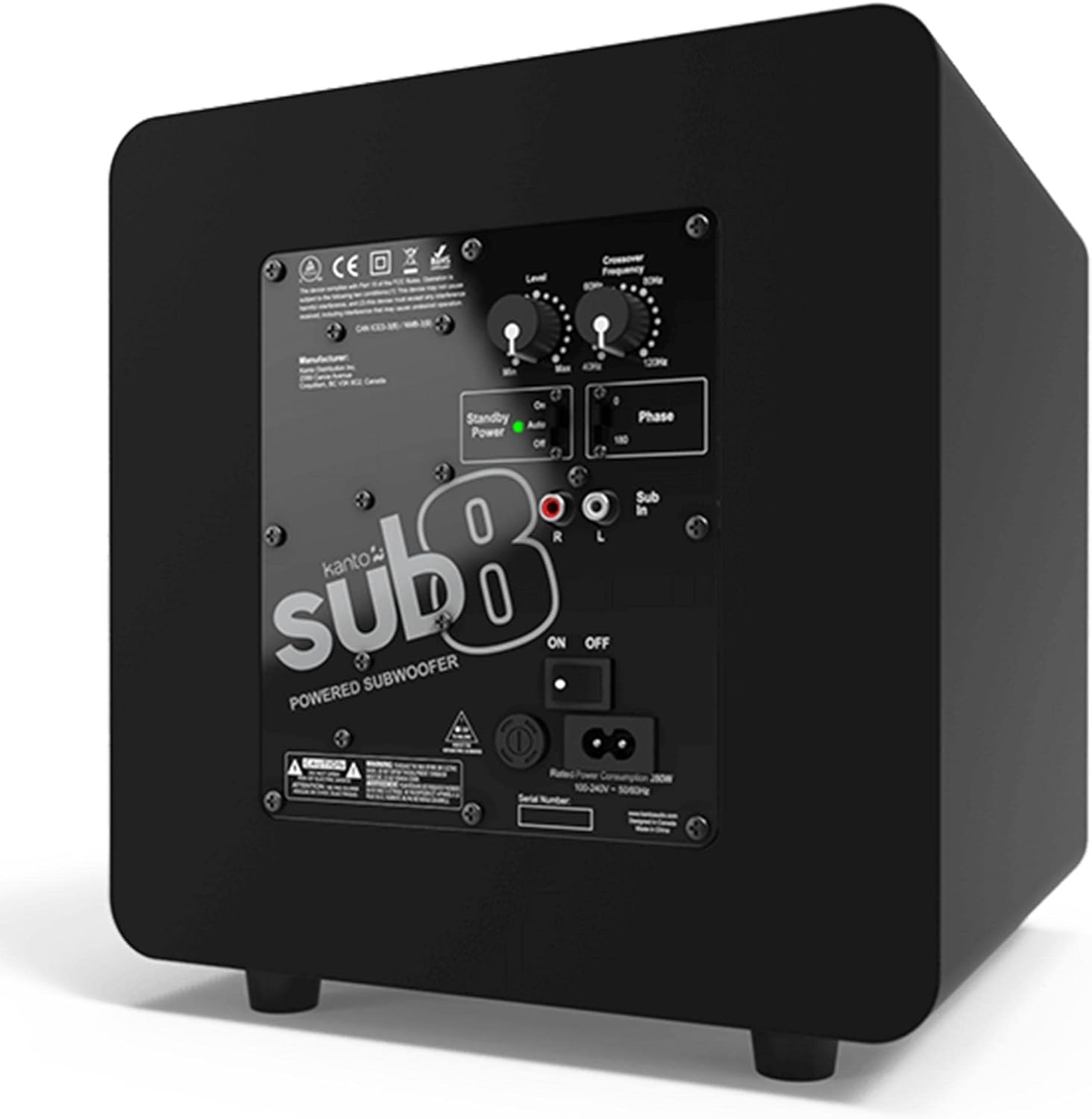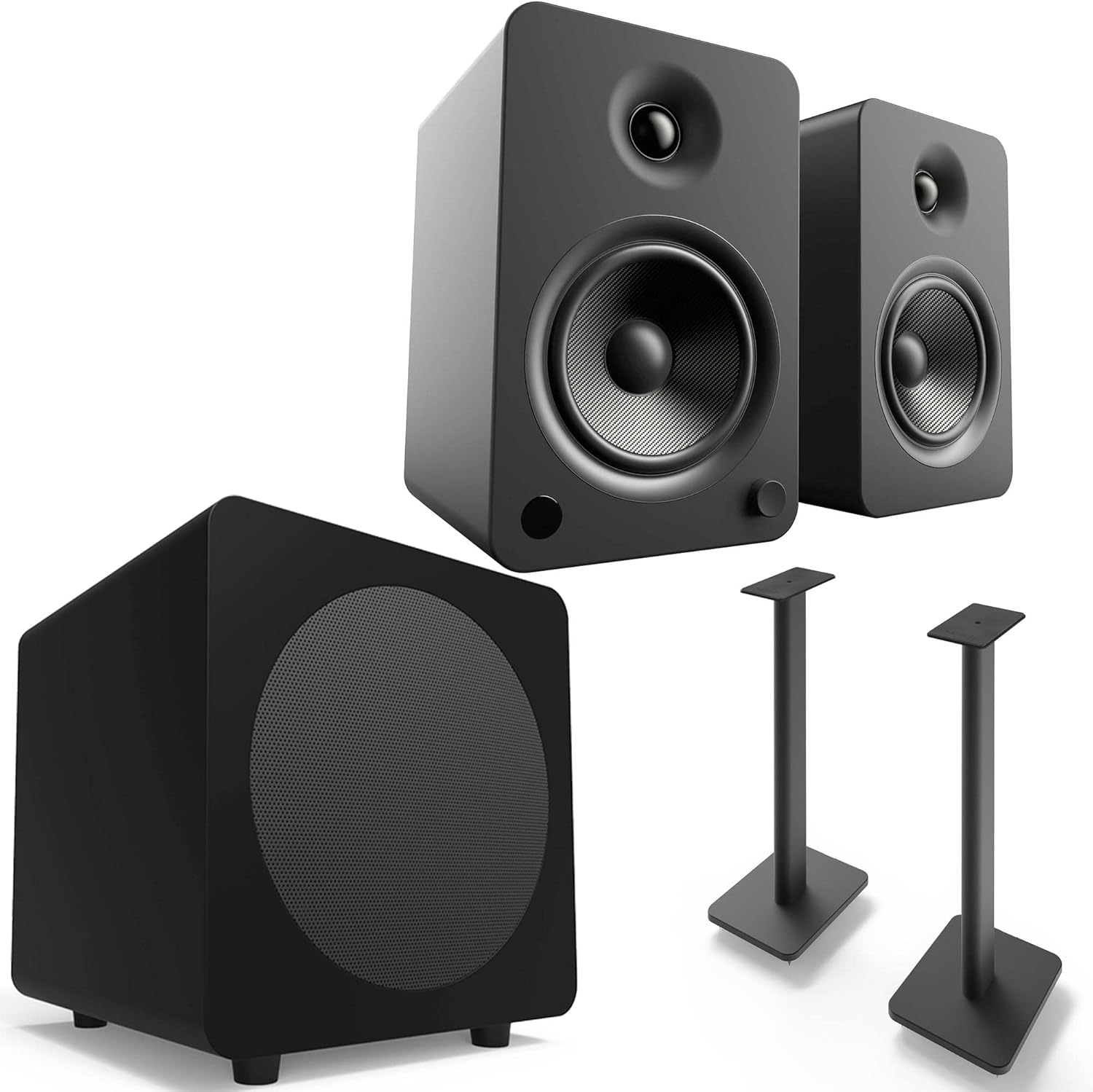 Bundle includes: Kanto YU6MB YU6 Matte Black 200 Watt Peak Powered Speakers with Bluetooth, Kanto SUB8MB SUB8 Onyx 8-Inch 250-Watt Powered Subwoofer - Matte Black - with RCA cable, Kanto SP26PL Pair of 26" Floor Speaker Stands with Security Mounting Screws, Pair, Black
