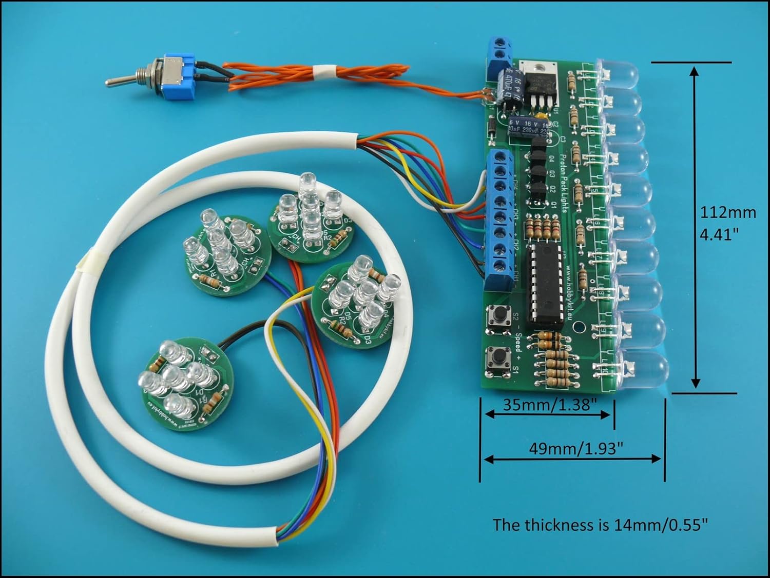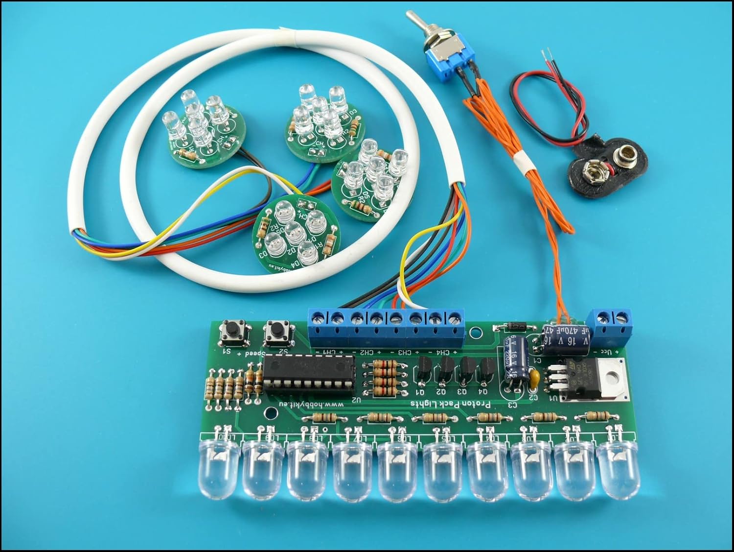24-inch (600 mm) wires between main board and cyclotron lights, with screw terminals. On-off switch mounted to a PCB with about 35cm (about 13.5 inch) of wire.