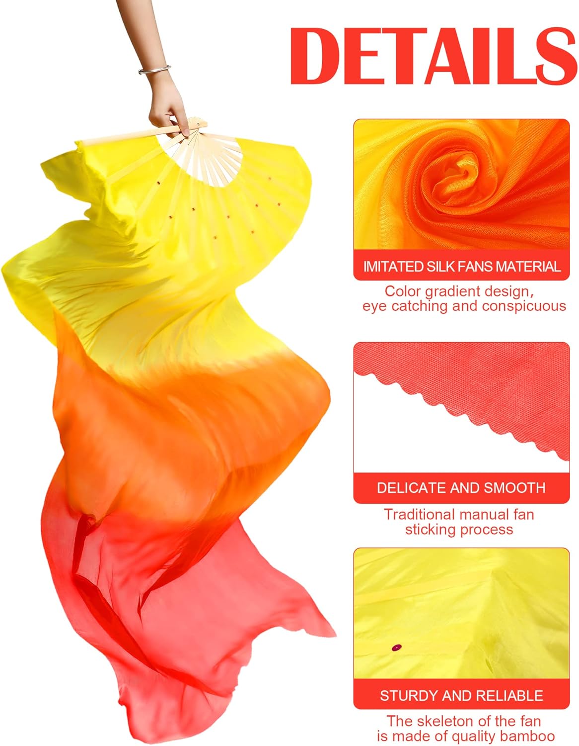 Beautiful and Attractive: these dancing fabric fans feature a color gradient design, including 2 different gradient colors, yellow orange red color and white blue sapphire blue color respectively, eye catching and conspicuous, easy to attract people's attention