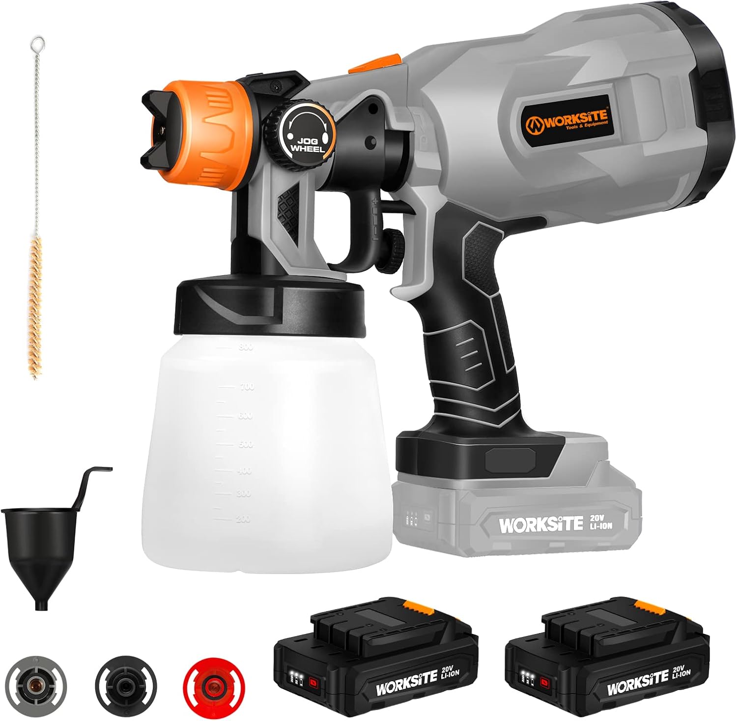 Pistola pulverizadora de pintura inalámbrica WORKSITE de 20 V con 2 baterías, pistola pulverizadora eléctrica y HVLP con 3 patrones de rociado, pomo de válvula ajustable para pintar techos, vallas, gabinetes y paredes