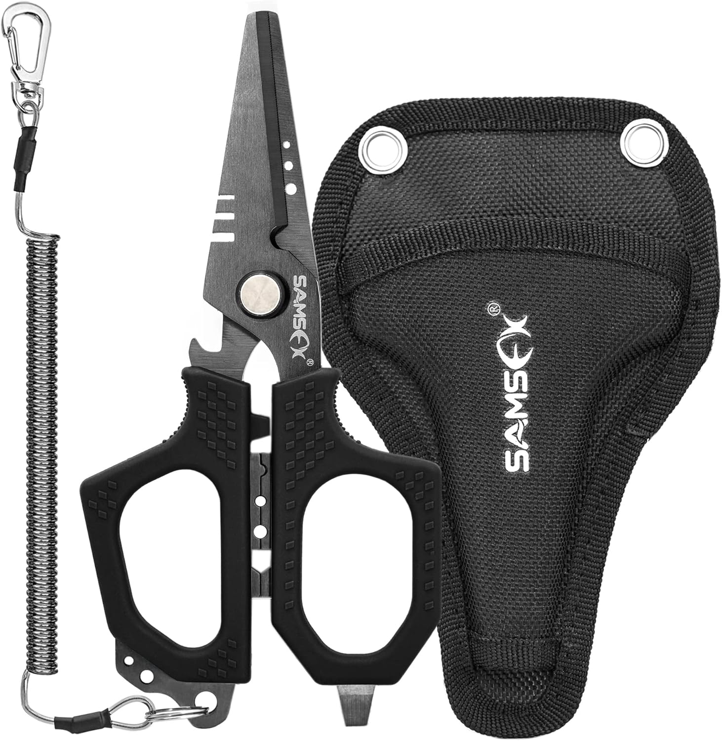 The SAMSFX Fishing Braid Scissors are multi-functional, lightweight, and durable. They are engineered with the micro-serrated to cut monocarbon, flurocarbon, or braided line with ease. the SAMSFX Scissors are also equipped with non-slip grip handles, split shot crimper, power notch, a tune baits tool, tighten knots tying tool, bottle opener, nylon sheath and coiled lanyard, truly making these the ultimate angling cutting tool.