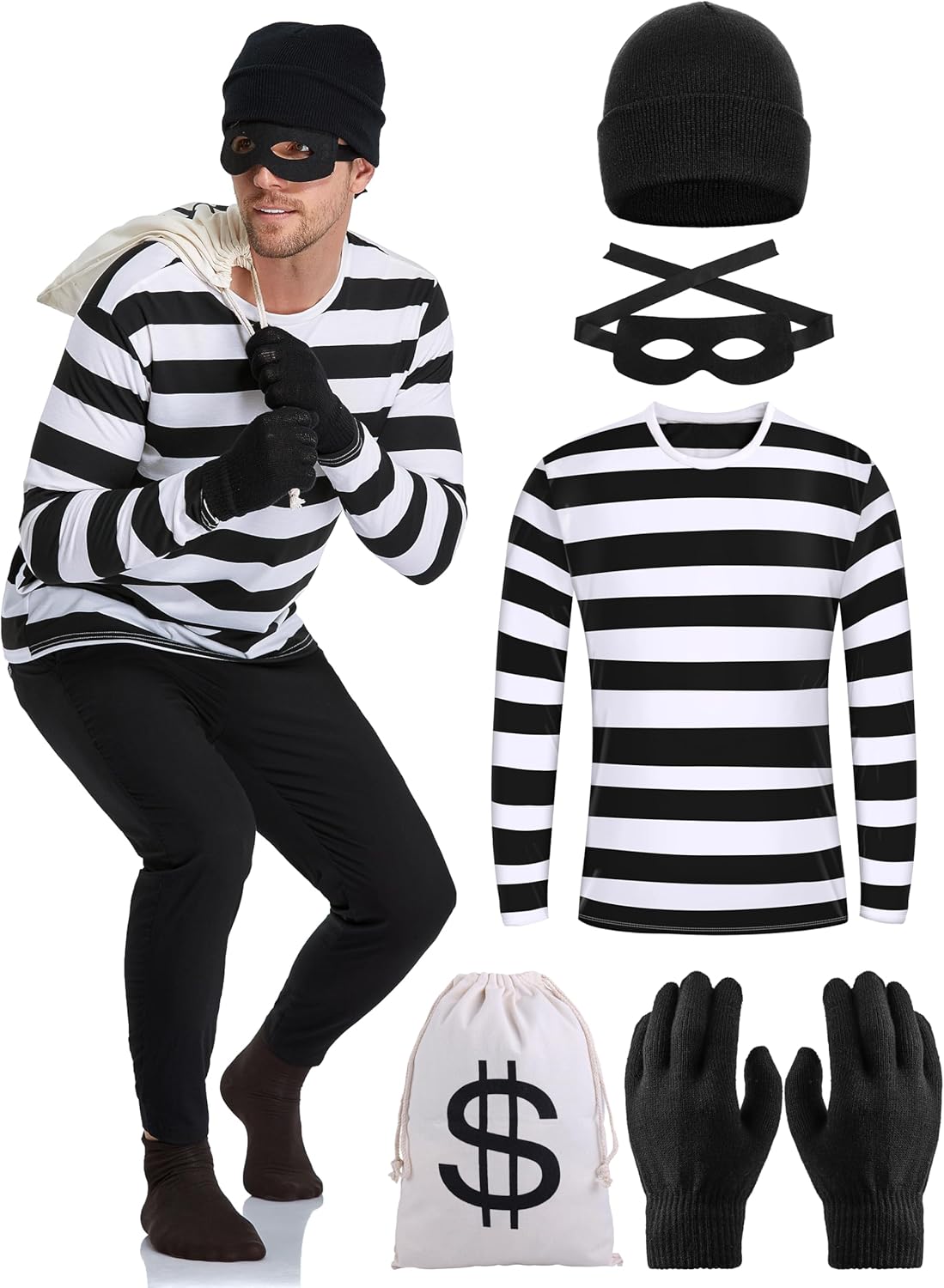 URATOT Halloween Robber Costume Set, Include Striped Long Sleeve T-Shirt Knit Cap Gloves Canvas Bags and Eye Mask