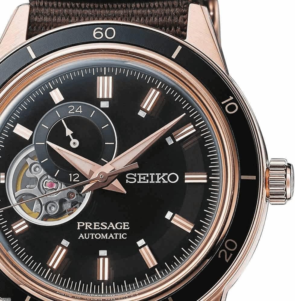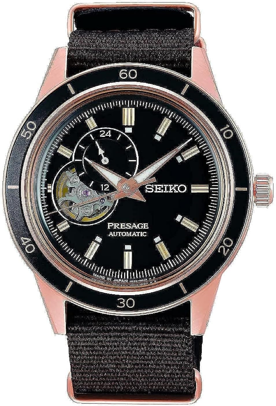 Características: Caja de acero inoxidable tono dorado rosa Correa de nylon Movimiento automático Calibre: 4R39 24 rubíes Cristal Hardlex Dial negro Display analógico Reserva de marcha Manecillas luminosas 12/24 horas Visualización Visera trasera transparente Hebilla de cierre Grosor aproximado de la caja: 40 mm Ancho aproximado de los asas: 20 mm Resistencia al agua de 50 m