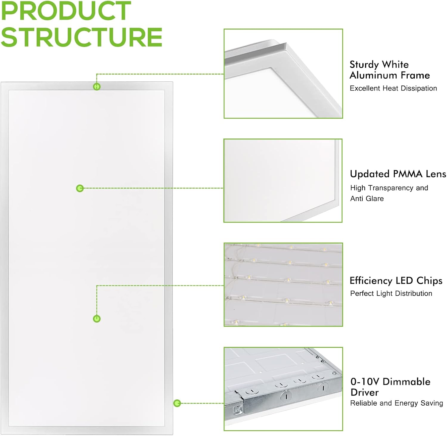 【HIGH PERFORMANCE】Smoothly dimming compatible with 0-10V dimmers. No flashing, No noise. Smooth PMMA cover with uniformity perfect light distribution.