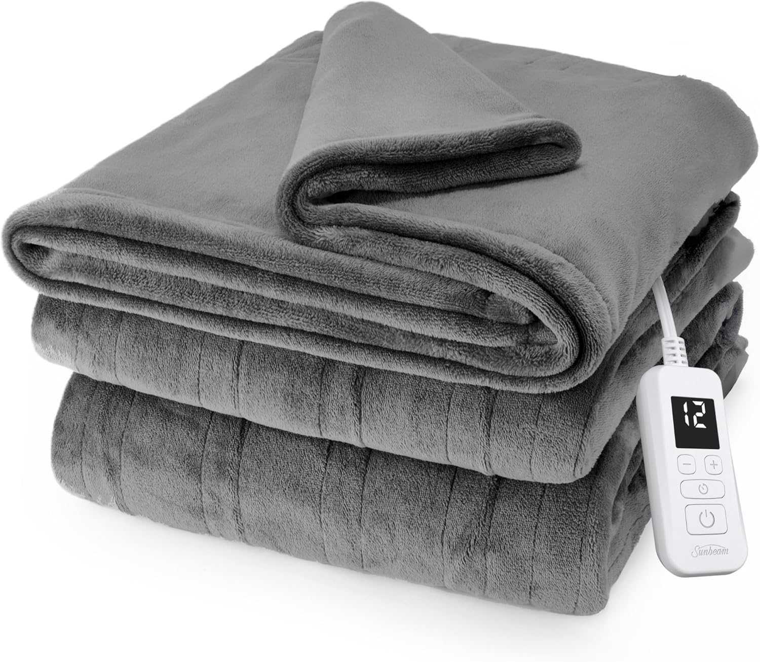 Sunbeam Royal Posh Velvet Heated Blanket snuggles you in cozy warmth on chilly nights. Experience the lush and silky royal posh velvet fabric to keep you warm and comfortable all night long. The Night Fog color enhances any bedroom decor, making this Full size (84” x 72" ) electric blanket make a stylish and practical addition to your home. Features a user-friendly dial controller that offers 12 personalized heat settings, allowing you to find the perfect temperature for your warmth and comfort. Plus, a 1 to 12-hour selectable auto shut-off function for added peace of mind. The heated wires are made with premium components developed with a wire technology that senses and adjusts for continuous heat and safe operation. When ready to clean, simply detach the controller from the blanket and place into the washing machine and dryer for easy care, stays silky soft wash after wash. Sunbeam is an American brand with more than 125 years of history in electric home appliances. All Sunbeam electric bedding products are ETL certified.