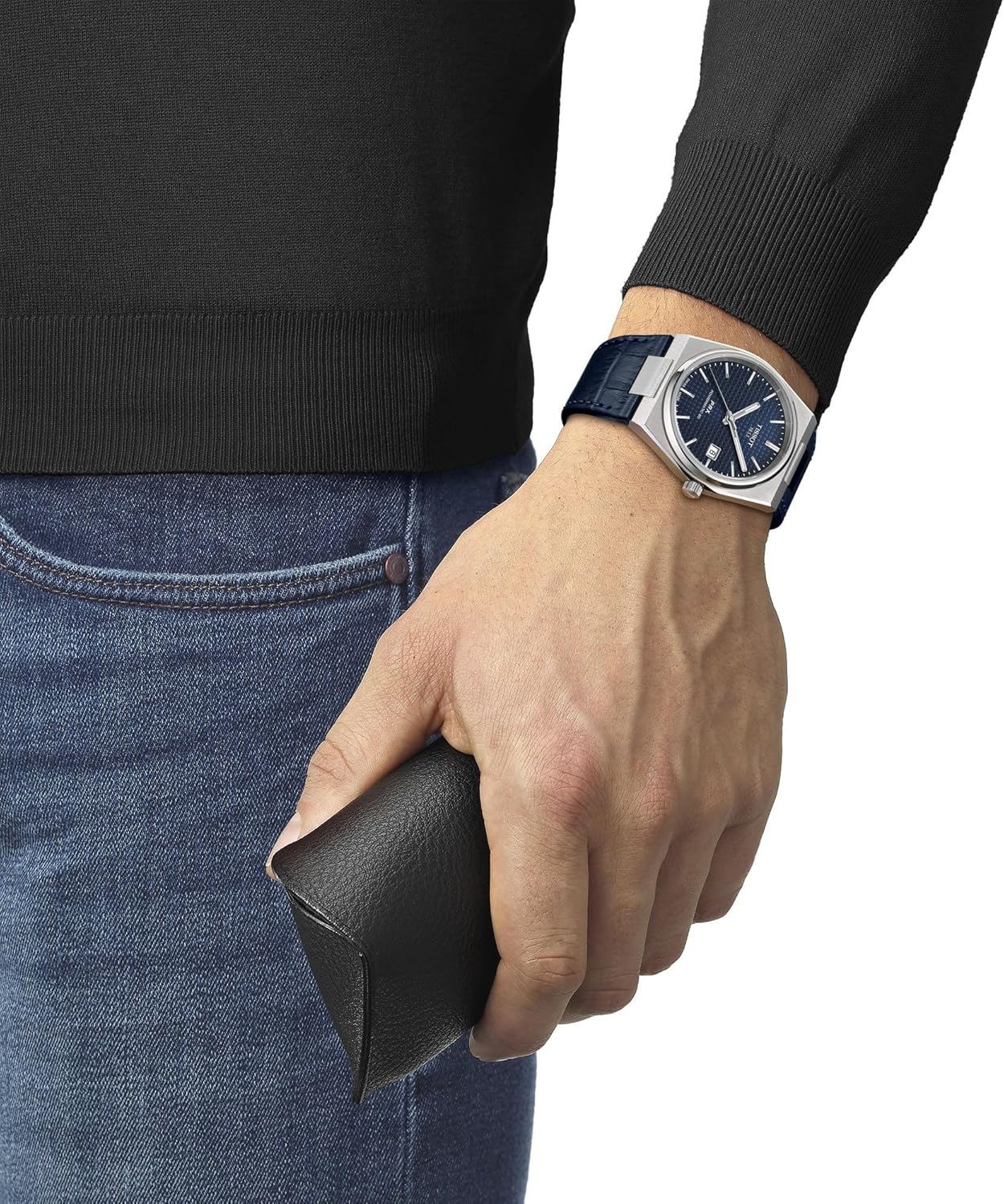 Reloj automático Tissot Mens PRX Powermatic 80 de caja de acero inoxidable 316L, azul, cuero, 12 (T1374071604100)