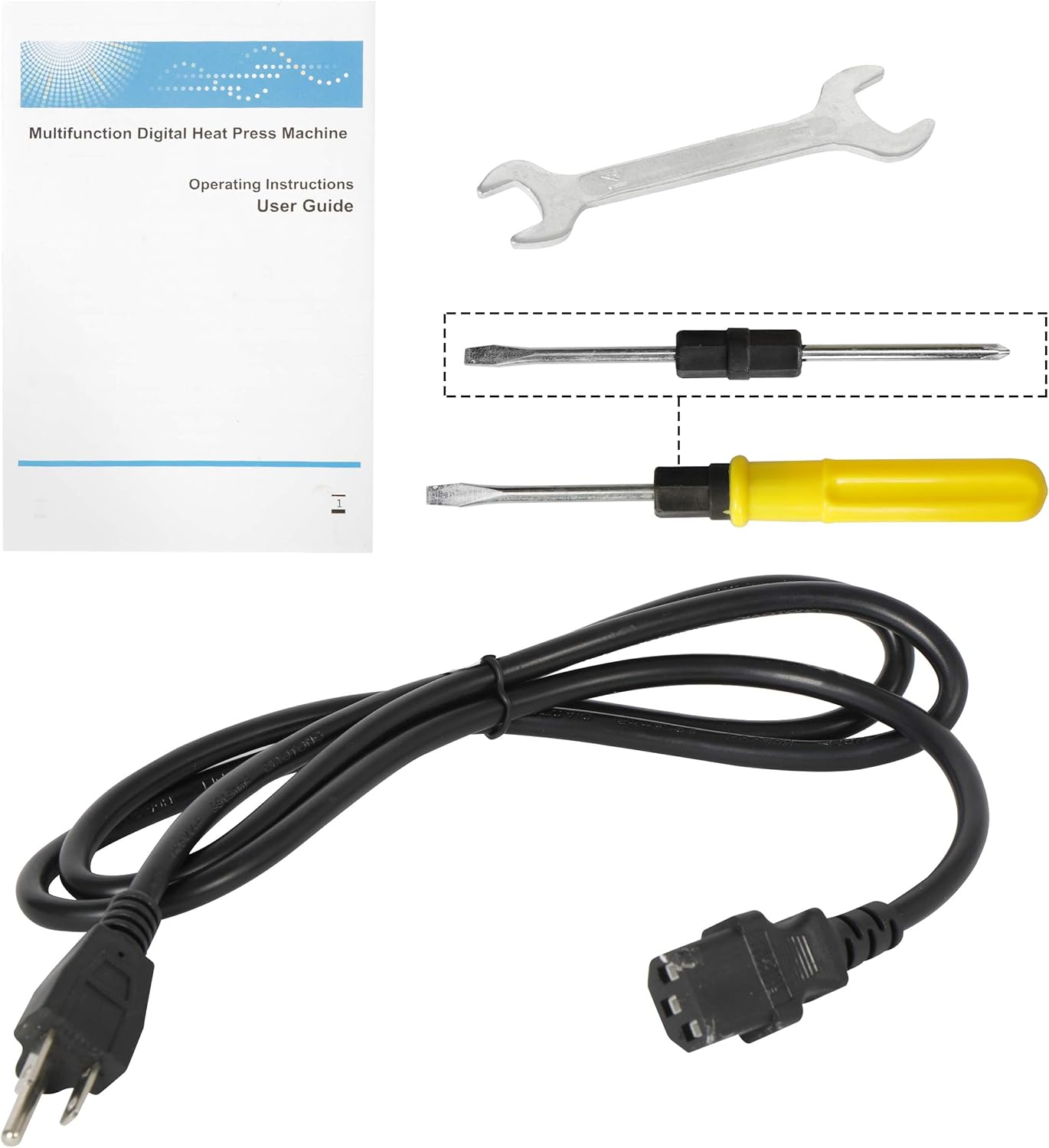 Five Elements: Each machine includes 1 x Platen Press (telfon-coated), 1 x Hat/Cap Press (curved),1 x Mug Press (11oz),2 x Plate Press (5" Max Diameter / 6" Max Diameter). This 5-in-1 combination machines can be used for t-shirts, caps, mugs, ceramic tiles and plates, mouse pads, fabrics and many other materials. You can easily transfer letters, images as well as numbers of various Fla surfaces.