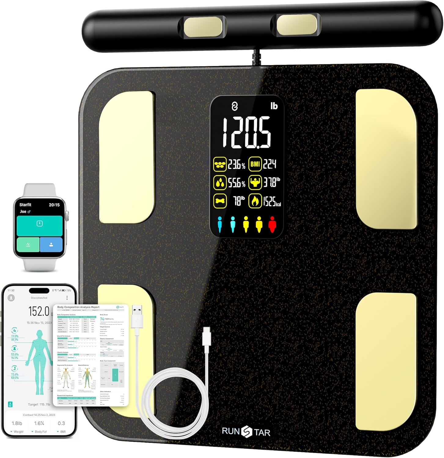 Escala para Peso Corporal, Analizador de Composición Cargable con Electrodos RunSTAR 8 de Alta Precisión con Índice BMR Medición Digital de Grasa Corporal y Músculo Pantalla Grande 400lb