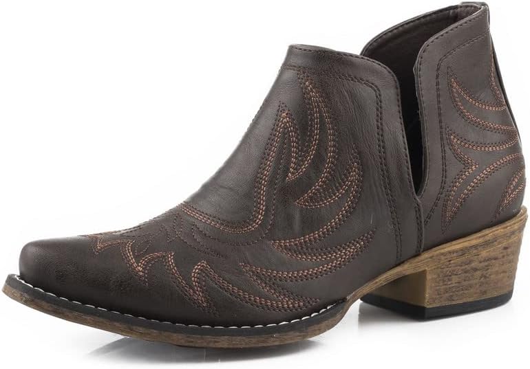 Put on a classic and yet modern style wearing Roper Ava boots. Man-made upper. Soft man-made lining for a comfortable fit and feel. Padded man-made insole for added underfoot comfort. Ankle boot with deep V-panels for easy movement and a stylish look. Stacked heel with a scoured detailing. Snip toe. Slip-on style. Lightweight man-made outsole with rubber heel cap for traction. Measurements:Heel Height: 1 3/4 inWeight: 12 ozShaft: 4 1/4 inPlatform Height: 2/5 in.