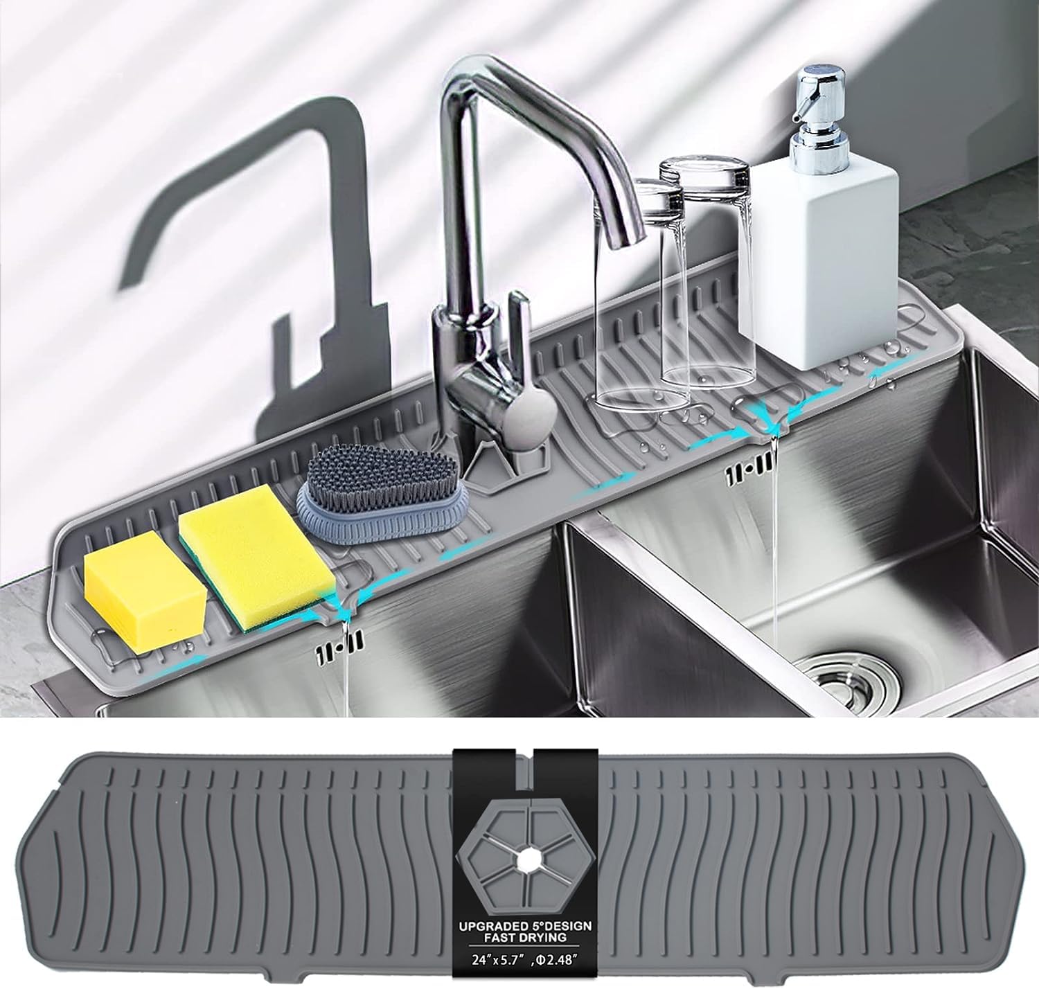 Grifo de cocina, protector antisalpicaduras para fregadero, alfombrilla de silicona de actualización de 24" x 5.6'' para atrapar agua, almohadilla de drenaje para fregadero detrás del grifo, alfombrilla de secado de goma para encimera, baño, casa de campo, RV (gris)
