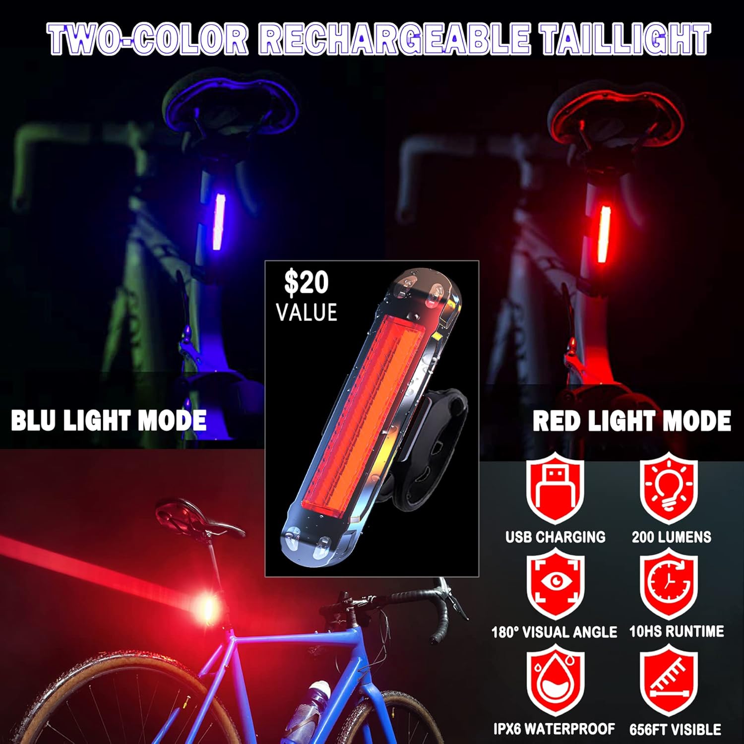 🎁🎁【Free Rechargeable Taillights Worth $20】Victagen Bike lights front and back come with free 5-mode tail light, rechargeable bicycle taillight with a max lifespan of 450hs, rear brightness will ensure you are seen and safe while night riding!!