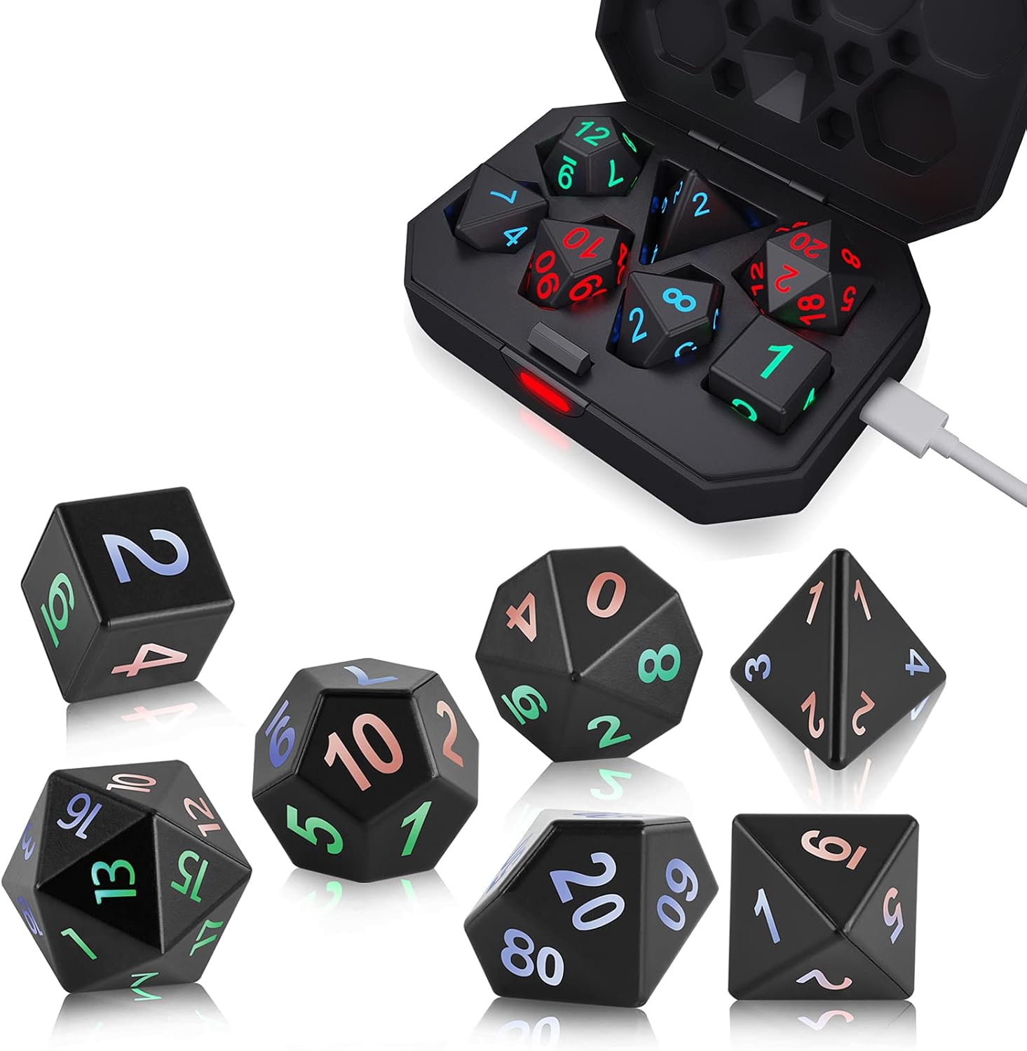 Light Up DND Dice for Dungeon and Dragons, 7 Pcs Glowing Polyhedral Dice Set with Charging Box, Rechargeable Electronic Dice, Luminous RPG LED Dice, Role Playing Table Games