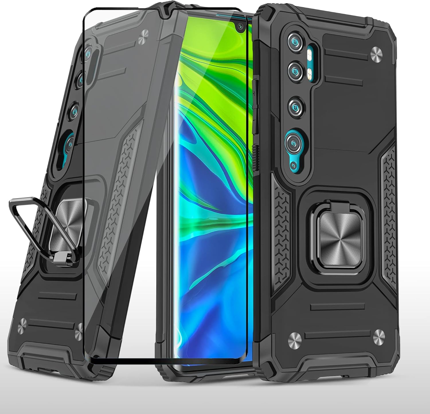 Asuwish Phone Case for Xiaomi Mi Note 10/Note10Pro/CC9 Pro with Tempered Glass Screen Protector Cover and Ring Holder Stand Slim Hybrid Protective Cell Accessories MiNote10 10Pro Women Men Black