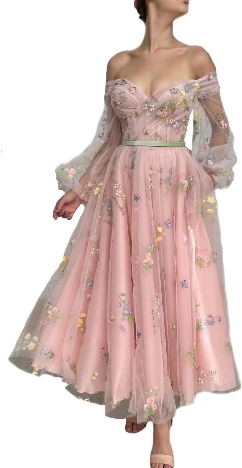 Fivsole, vestidos de fiesta formales de tul con encaje floral y manga abullonada para mujer