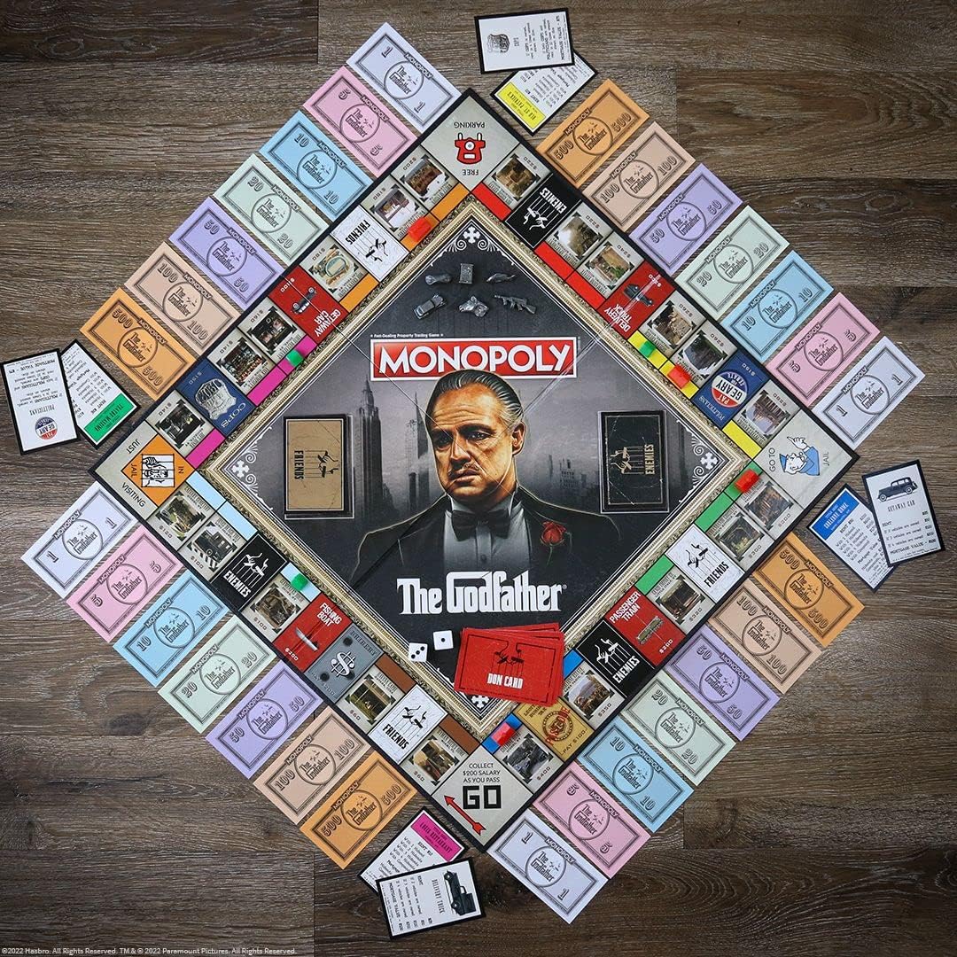 Compra, vende y negocia para llegar a la victoria mientras recoges propiedades que incluyen ubicaciones de la película como Corleone Home, Corleone Estate, Genco Import Co., Basílica de San Pedro, Tommasino Estate, Casino de Moe Green, y más. También presenta cartas “Don” para giros adicionales en el juego que te ayudan a adelantarte y hacer crecer el imperio de tu familia.
