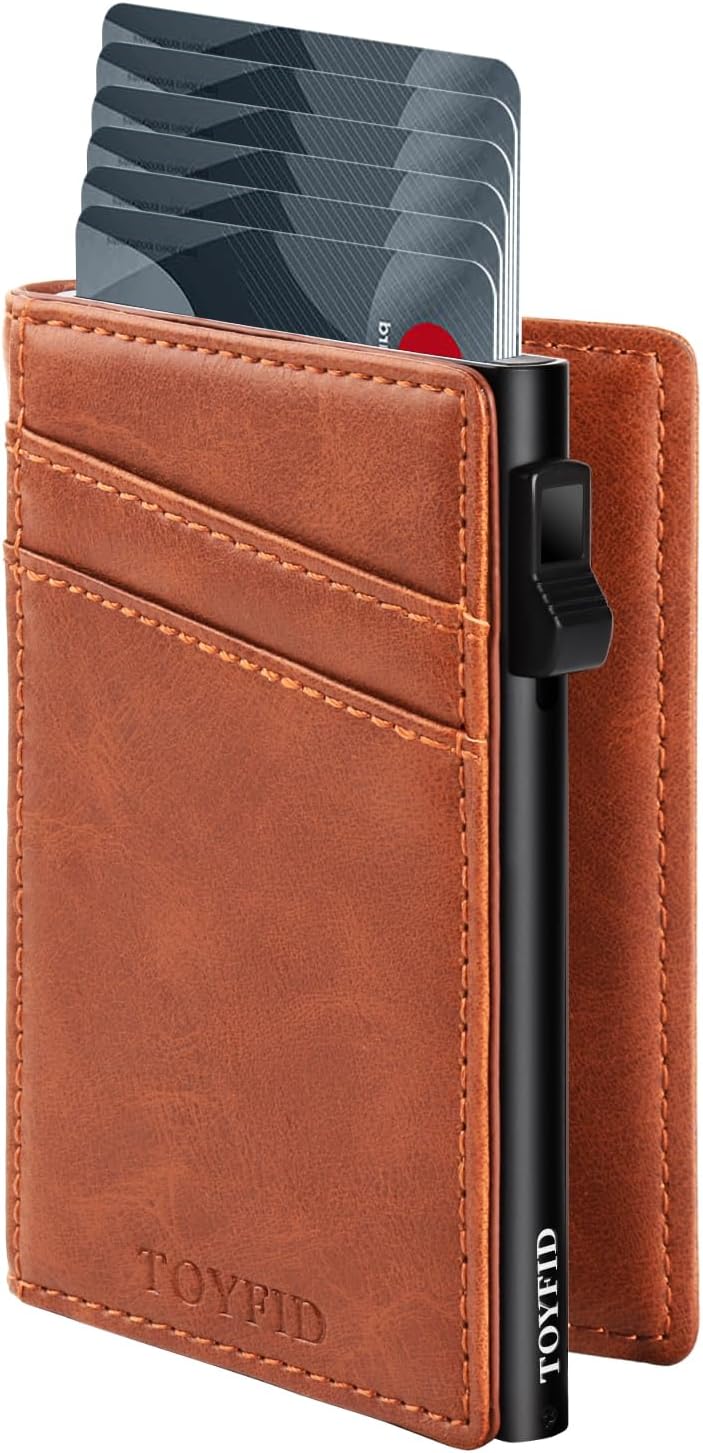 Cartera Minimalista para Hombre, Cartera delgada para Hombre, Cartera Pop Up, Soporte de Tarjetas delgado con Bloqueo RFID, Cartera de Cuero con Bolsillo para Dinero, Estuche de Tarjetas Minimalista Hasta 11 Tarjetas de Crédito (Marrón)