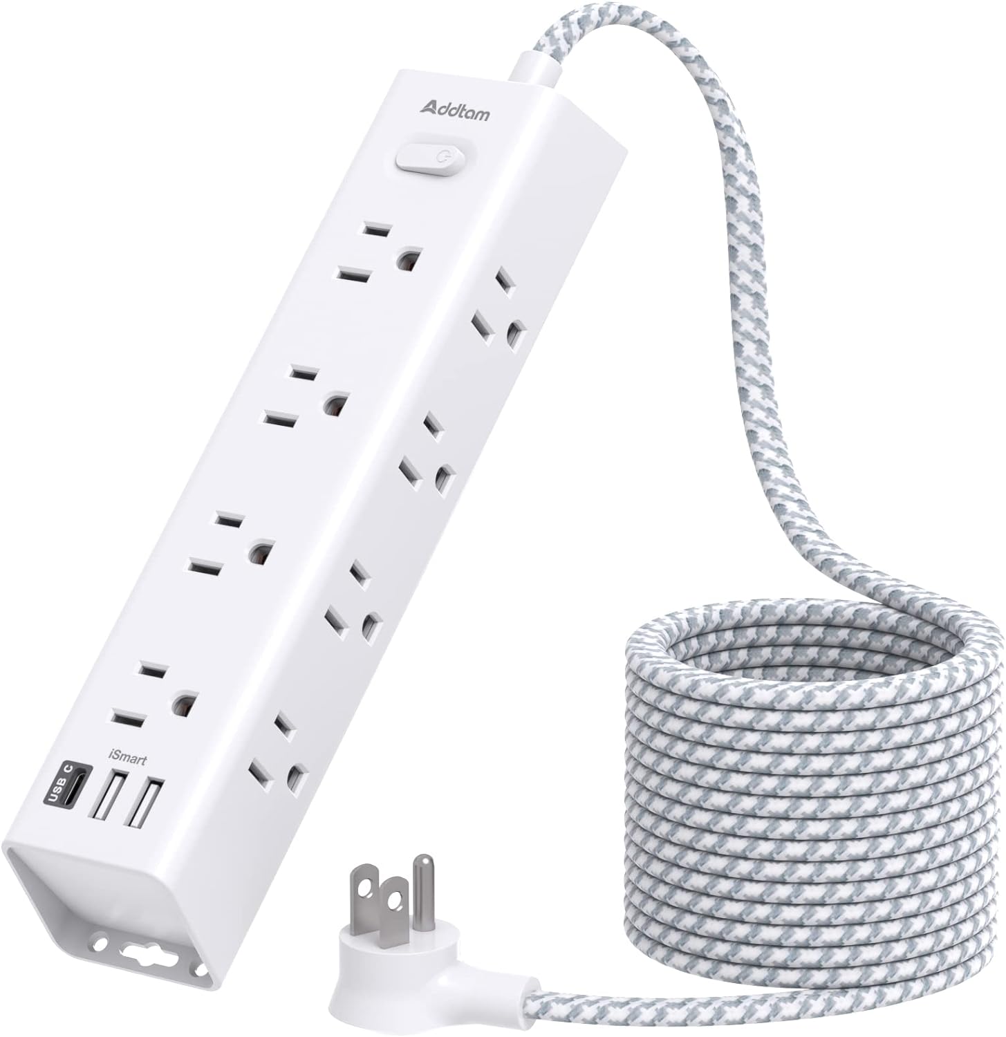 【10 FT Long Extension Cord】 - This long power strip with 10ft is long enough to make it more flexible, flat plug design indoor extension cord with usb can fit easily in tight spaces, such as desk, nightstand; 45 degree right-angle create enough room makes this usb power strip flat plug does not obstruct other plugs, suitable for installing behind sofa, wardrobe, bookshelves, and other furniture