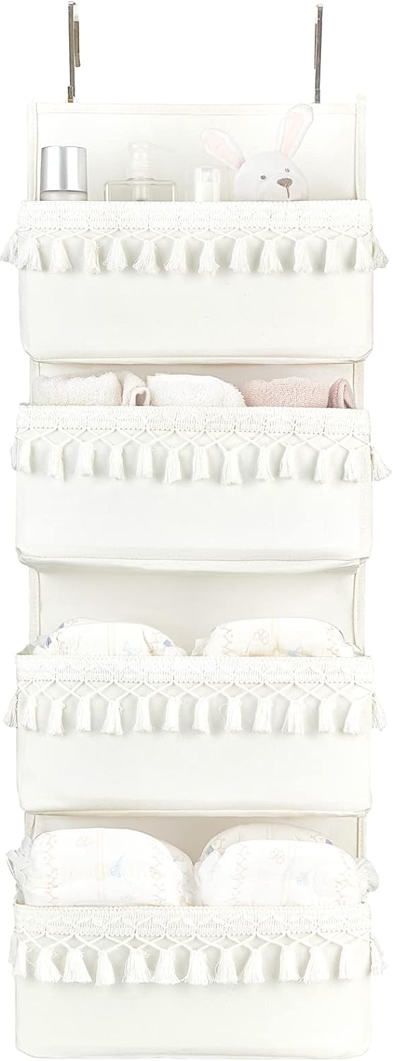 Dahey Over The Door Organizer Boho Nursery Storage Decor Closet Hanging Organizer with Tassels Decoration for Bedroom Nursery Bathroom Apartments Dorm Pantry, 4 Pockets, White