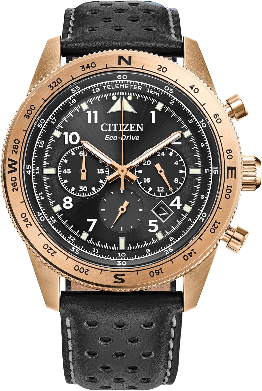 Citizen Men's Eco-Drive Weekender Sport Casual, Rose Gold-Tone Stainless Steel Watch, Black Leather Watch, Chronograph (Model: CA4553-01E).