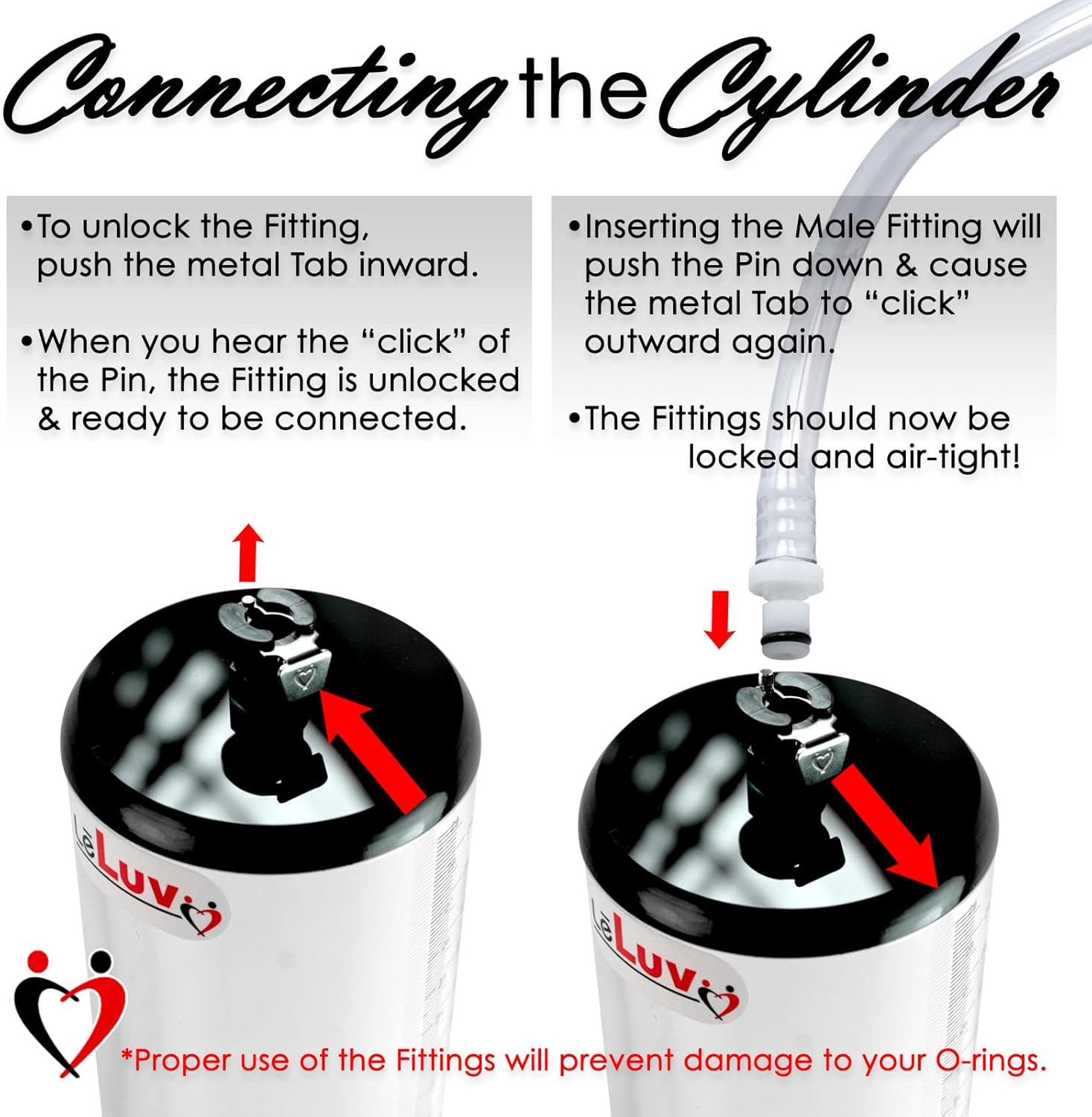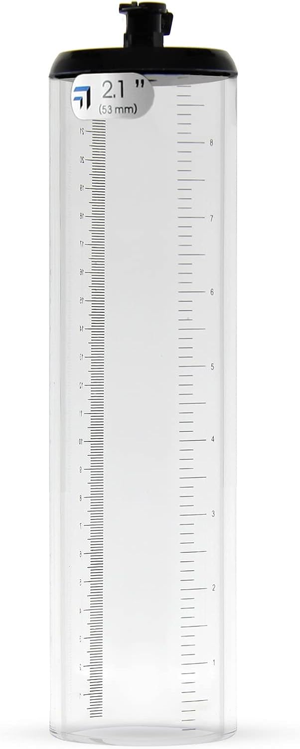 LeLuv Thick Walled Cylinder for Penis Pumps, Seamless Untapered Clear Acrylic, 2.1 Inch Diameter x 9 Inch Length with Measurement Marks and Locking Vacuum Fitting. Extra-thick, with no seams, clear highest-grade acrylic vacuum cylinder with no flange feature. Imperial and metric measuring marks on eather side are embossed into the clear acrylic, easy to see and use. No manufacturing seams are present on the untapered sides of this LeLuv penis pump cylinder. Includes our quick-disconnect vacuum fitting that holds the vacuum after the pump is disconnected from the cylinder. This cylinder has no flange, instead the thick wall is rounded smooth at the bottom for comfort. When used with a LeLuv or Eyro Quick-disconnect Male Fitting, the cylinder can be disconnected from the pump and still retain vacuum! Compatible with LeLuv and Eyro Brand Pumps & Cylinders equipped with Quick-disconnect Fittings ONLY, we do not guarantee fitment or function with any other brand.