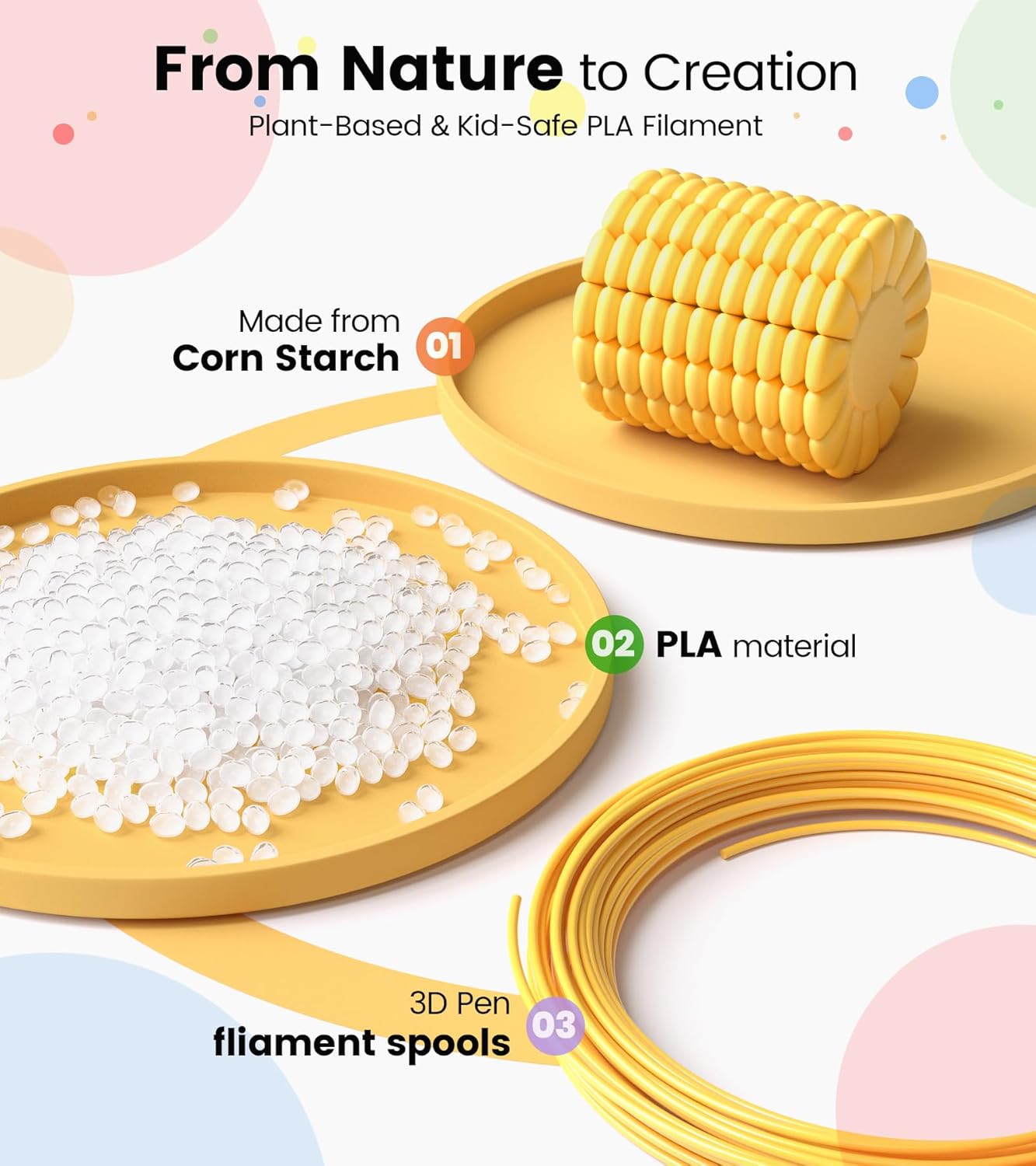 🛡️Filamento PLA: el nombre completo es Ácido Poliláctico, hecho de almidón de maíz, tiene un excelente rendimiento en un amplio rango de temperatura, fuerte, moldeado rápido sin burbujas, es el filamento perfecto para añadir a la pluma 3D.