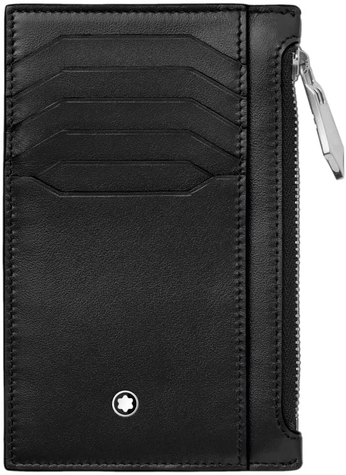 Very nice card case with coin compartment for men from Montblanc brand. The Meisterstück case with eight card slots is made of leather in deep glossy black. The new simple geometric design of the creation optimises its functionality with numerous card slots, compartments for receipts and a coin pocket with zip. Its compact shape makes it fit in most bags. Dimensions: 13.5 cm x 8.5 cm x 0.5 cm.