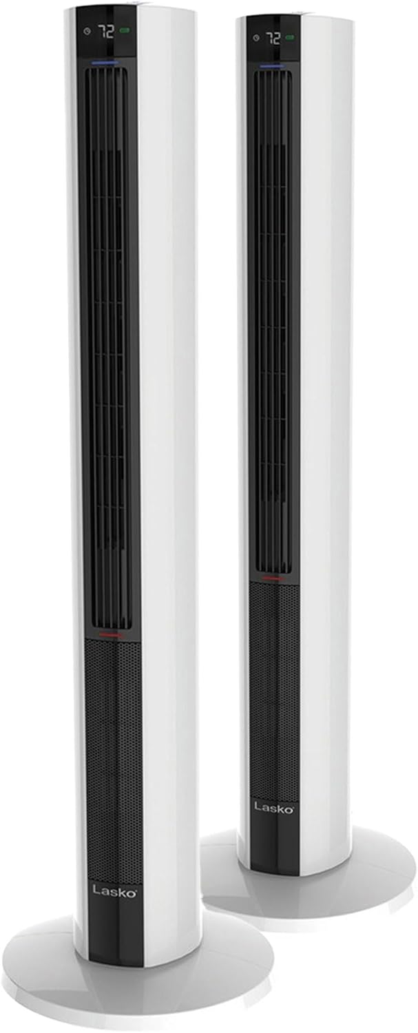 Enjoy year-round comfort with Lasko’s All Season Comfort Control Tower Fan & Heater 2 Pack. These units feature a high-reaching tower design for maximum air delivery with a small footprint, so it won’t take up much space. Create gentle breezes with 4 quiet fan speeds (high, medium, low, and super low), bask in soothing warmth with 3 heat settings (high, medium, and low), plus one heater/fan combination mode which simultaneously activates high heat and super low fan. The AutoEco automatic electronic thermostat allows you to heat the room you’re in and maintain comfort using less energy. The multi-function digital remote control with onboard storage allows you to operate the fan and heater functions, as well as oscillation, timer, and power. The easy-to-clean filter keeps your heater unit running efficiently. Cool off this summer and heat up this winter with the All Season Comfort Control Tower Fan & Heater 2 Pack from Lasko.