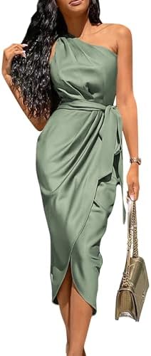Vestido ajustado a media pierna PRETTYGARDEN para mujer, verano 2023, sin mangas, sin mangas, con un solo hombro, de satén, con cinturón de satén