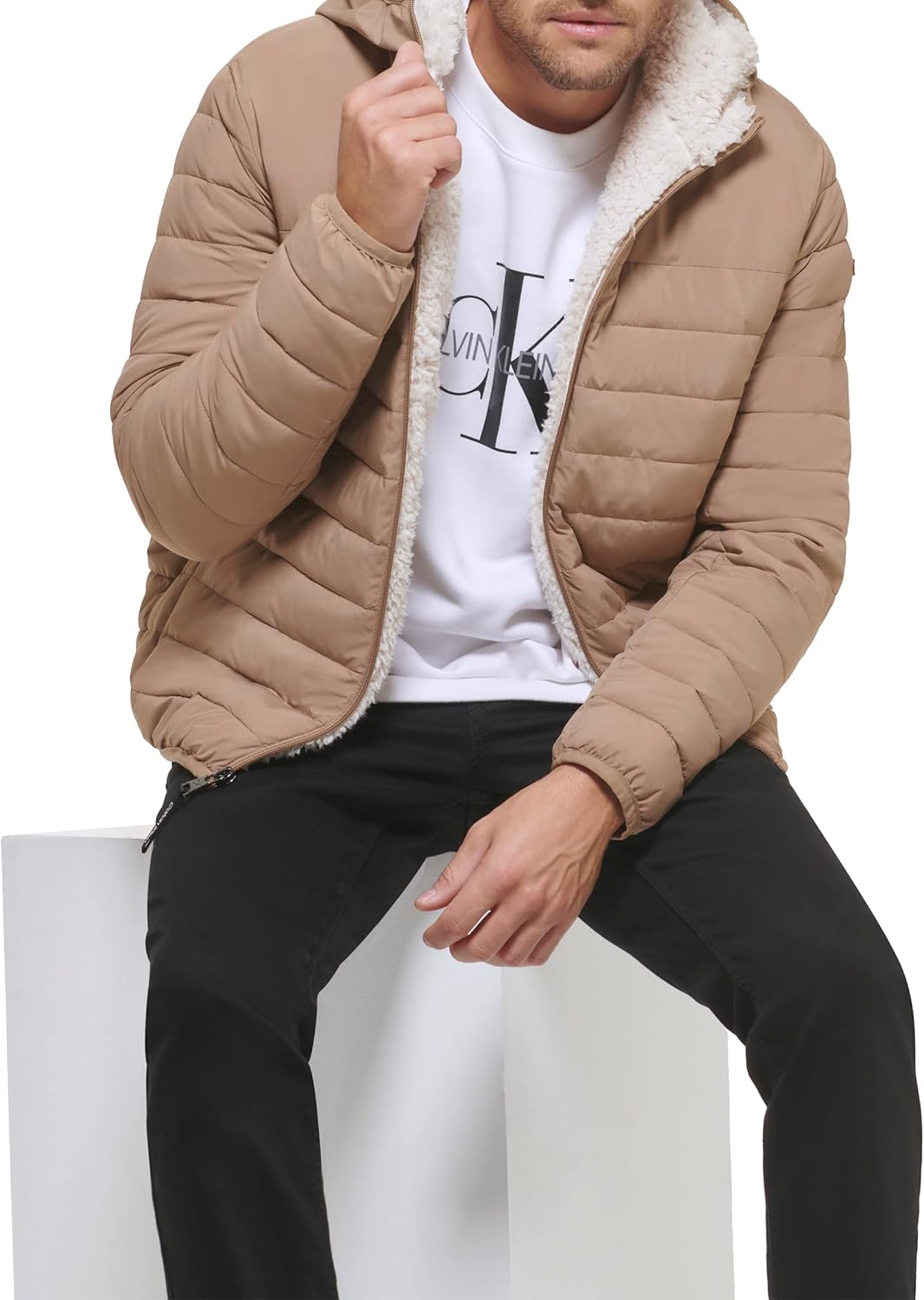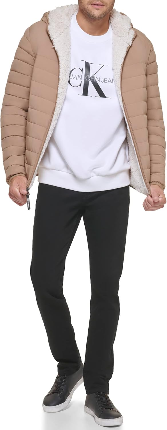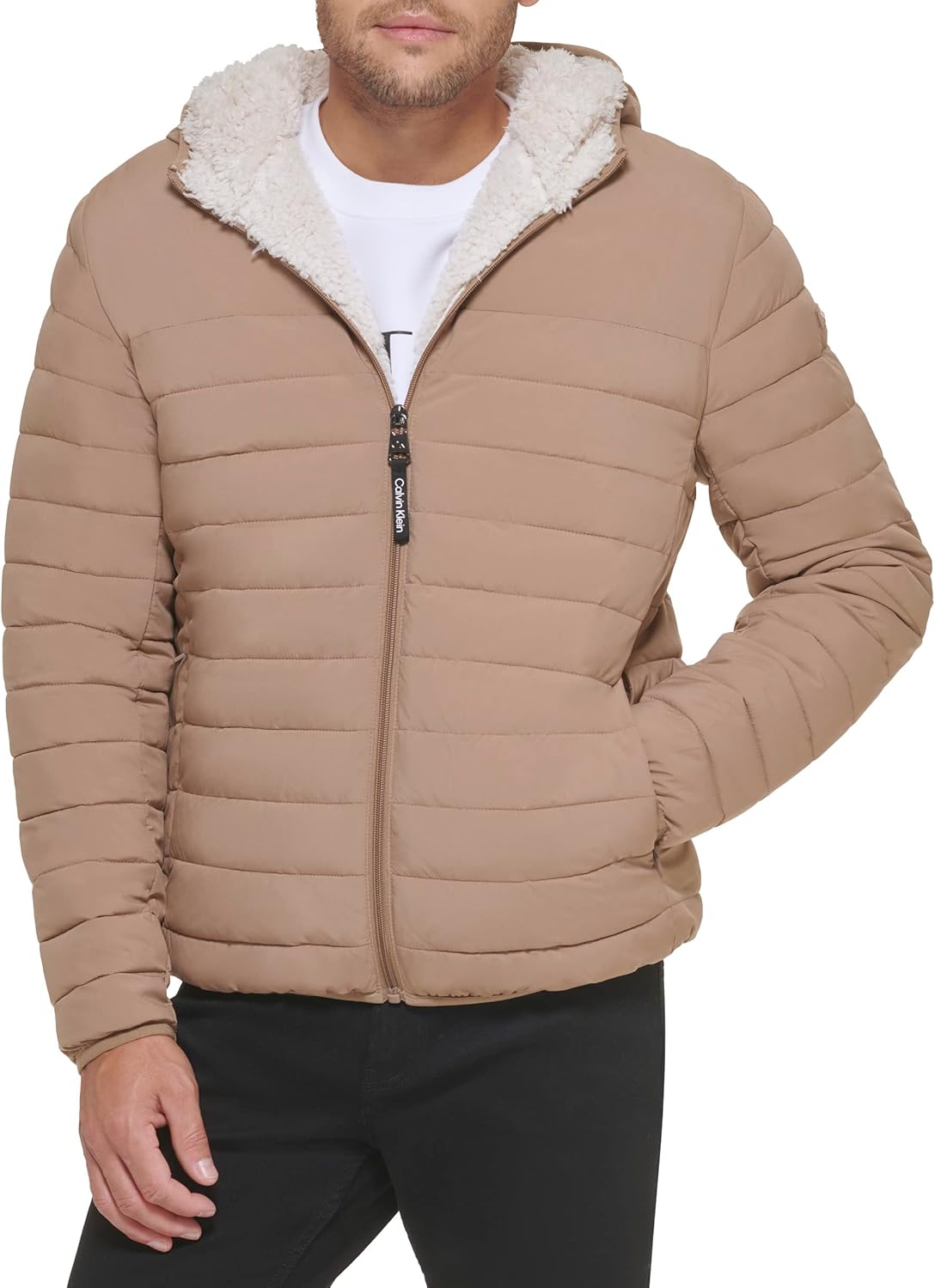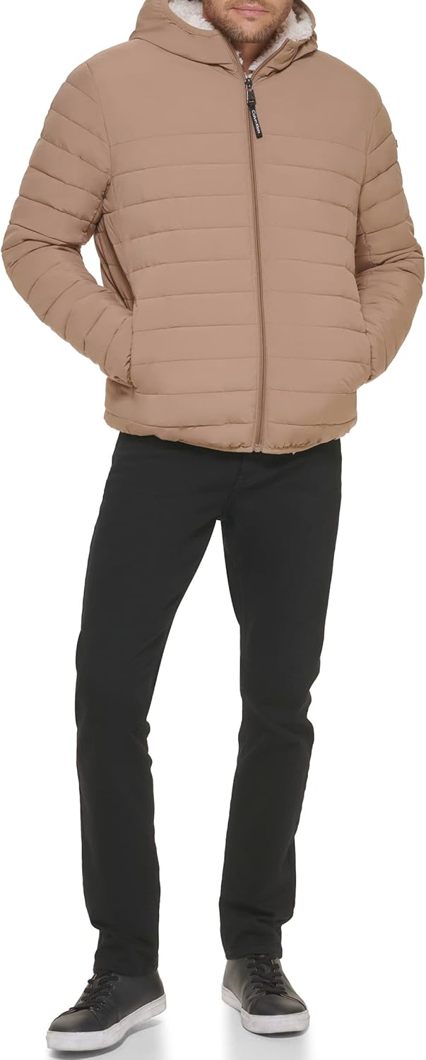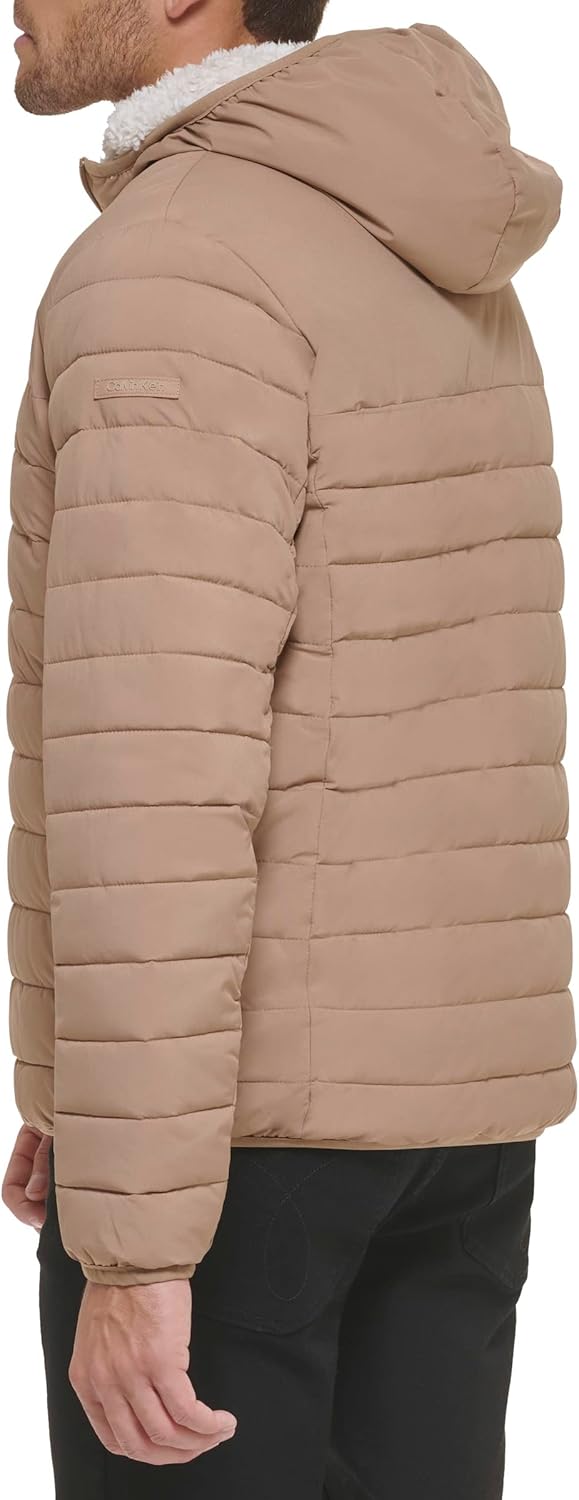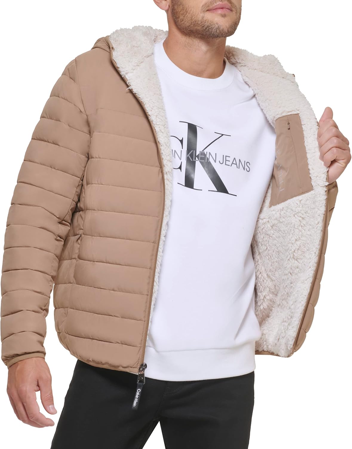 Calvin Klein mens Lightweight Packable Down Jacket With Fleece Bib and Removable Hood