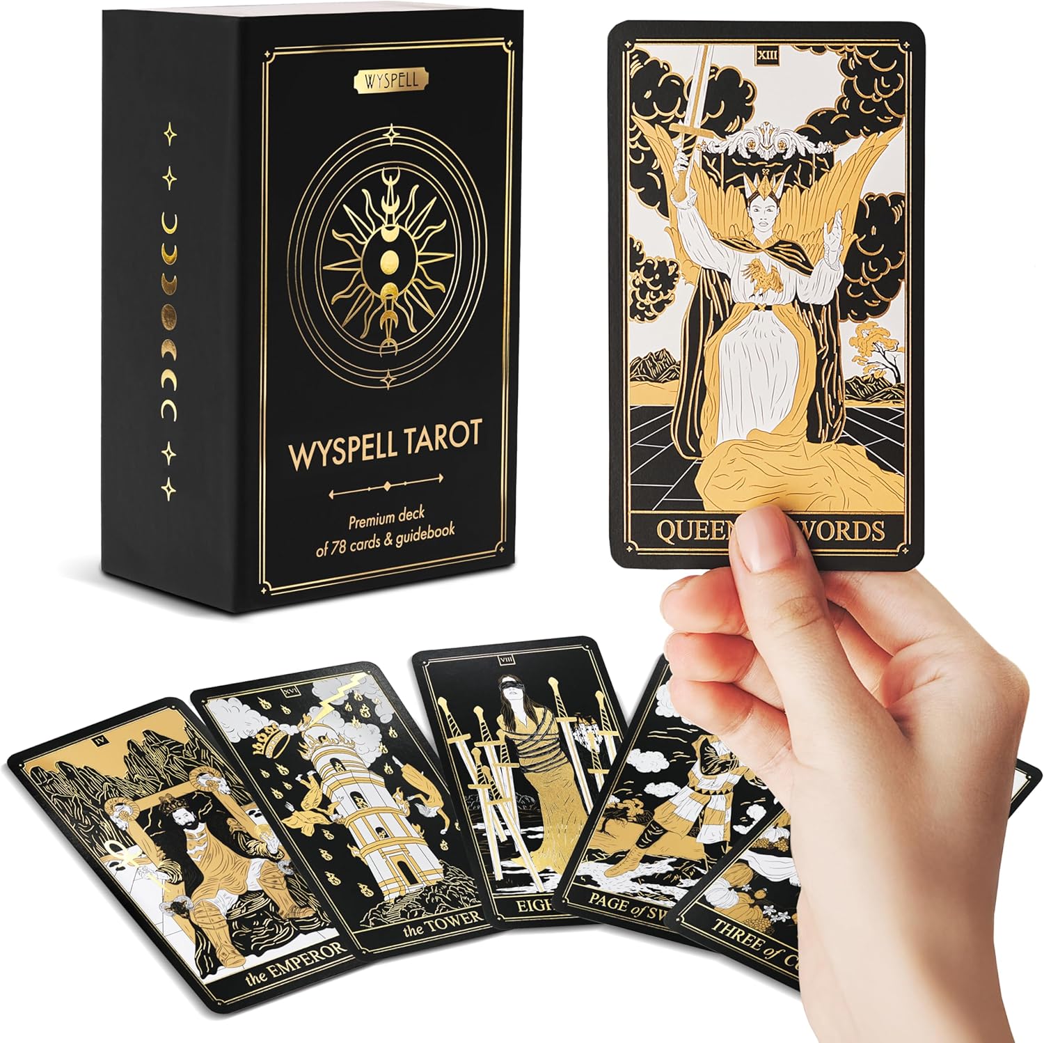 Cartas del Tarot Clásico Wyspell con Libro de Guía - 78 Cartas Dorada para Principiantes - Baraja de Tarot Negra con Libro de Guía - Baraja Original con Libro de Guía