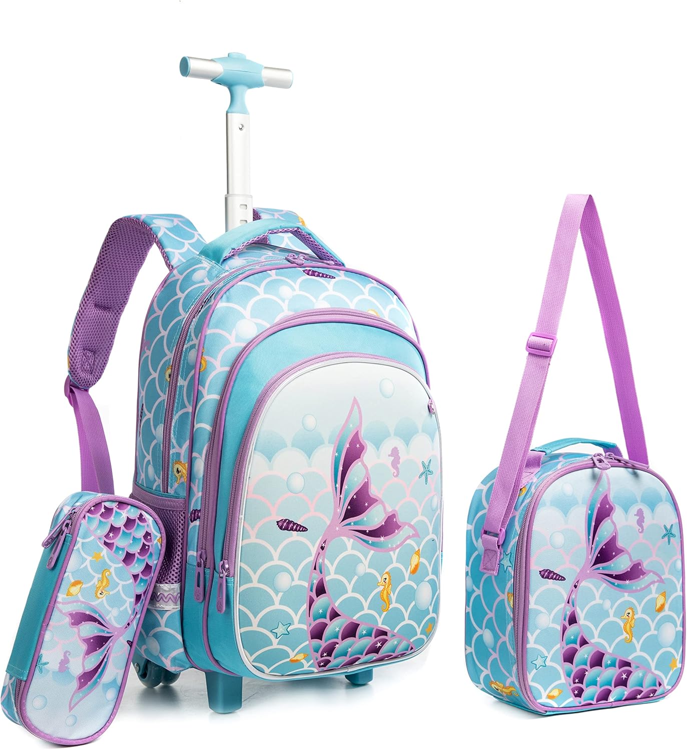Meetbelify Girls Rolling Backpack Wheels Backpacks Kids Luggage for Elementary Preschool Students Cute Suitcase Trolley Trip Wheeled Mermaid Backpack with Lunch Box for Girls