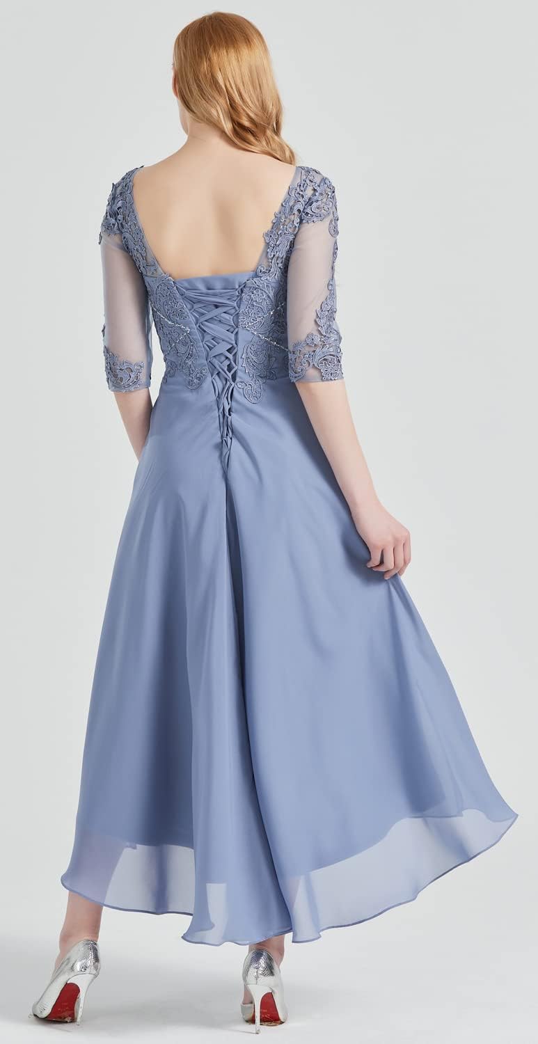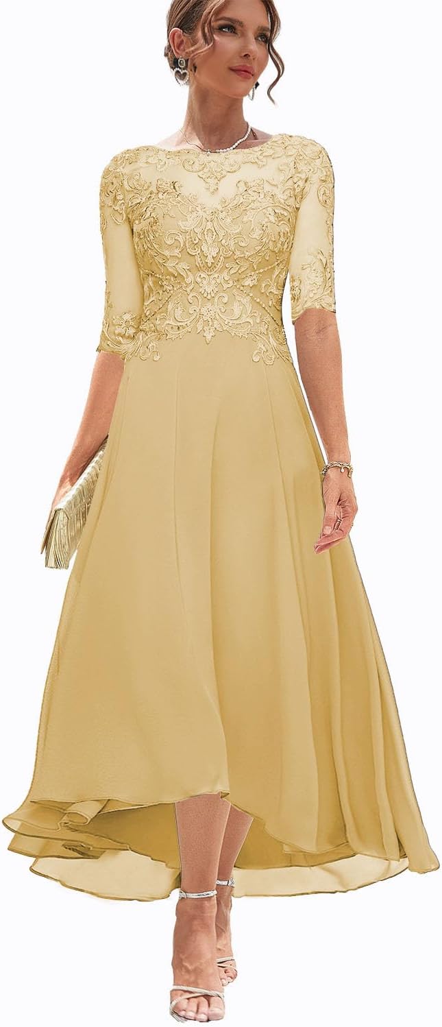 Tea Length Mother of The Bride Dresses for Women High Low Formal Dress with Sleeves Lace Evening Gown