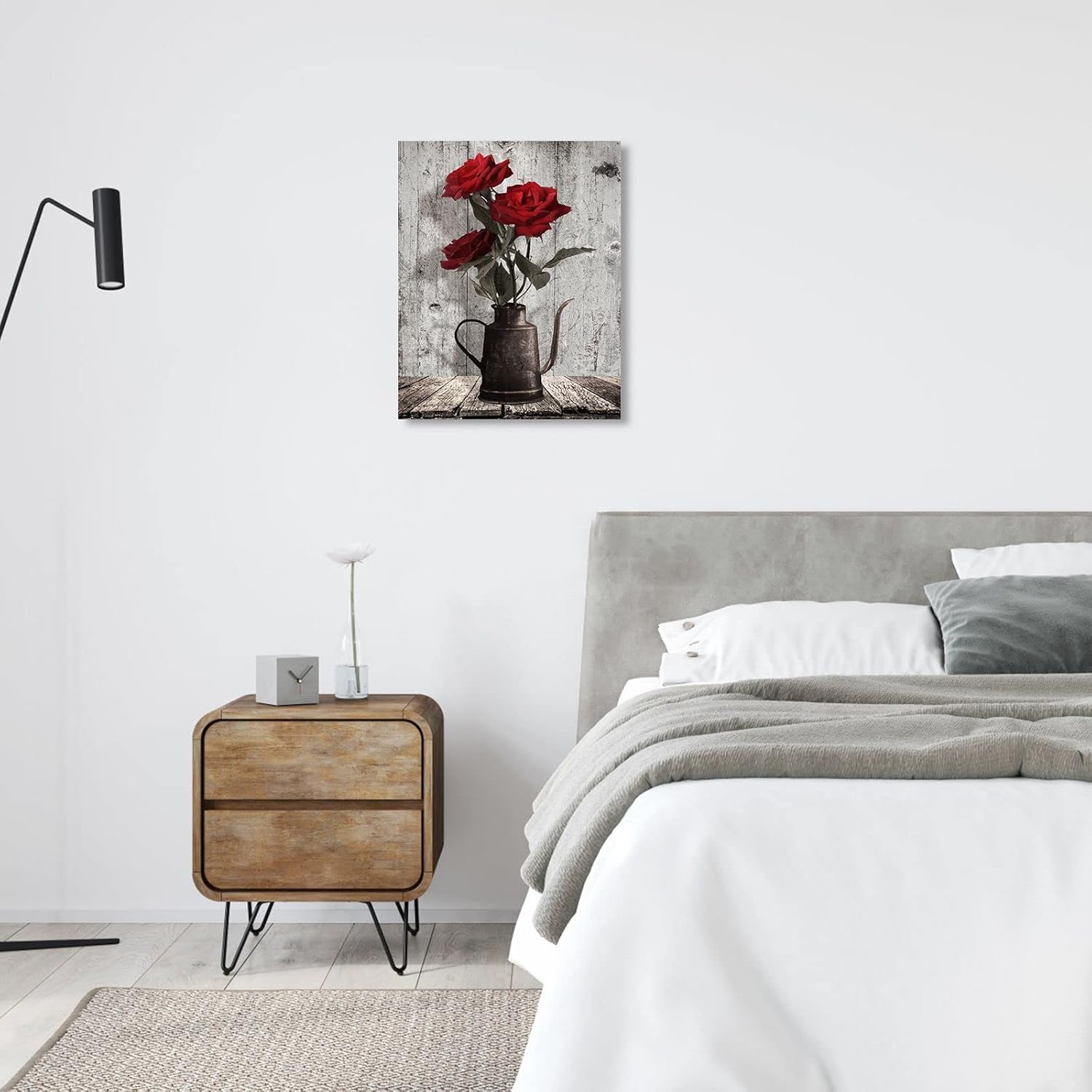 Red Rose Canvas Wall Art: Rustic Black White Flower Framed Bedroom Decor - Vintage Vase Picture Home Decoration Farmhouse Print Artwork for Living Room Kitchen 12" x 15"