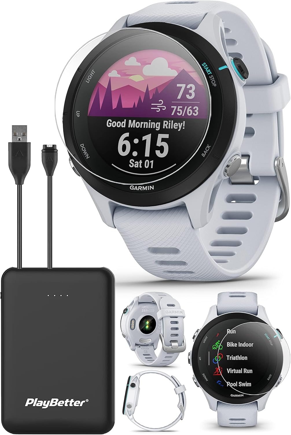 Garmin Forerunner 255S Music (Whitestone) GPS Running Smartwatch | Runner’s Bundle with HD Screen Protectors & Portable Charger | VO2 Max, Race Predictor, Body Battery, Heart Rate & Recovery