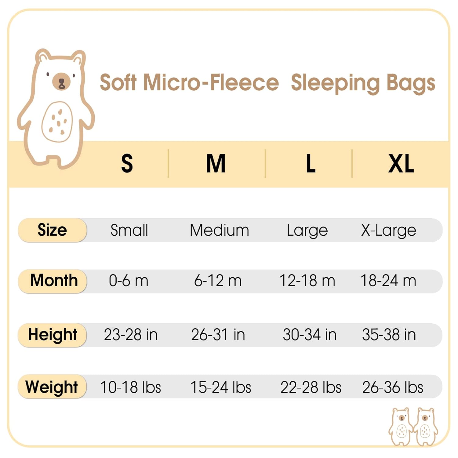 Warm Tips: PHF fleece sleep sack can be machine washed or hand washed at low temperatures, even after many washes they keep their softness and color. A set of 2 newborn baby sleep sack makes it easier to change and clean up daily. There are 4 sizes about PHF baby sleep sack: S(0-6 months/ 10-18 lbs/23-28 in), M(6-12 months/15-24 lbs/26-31 in), L(12-18 months/22-28 lbs/30-34 in), XL(18-24 months/26-36 lbs/ 35-38 in), you can choose the fittest one.