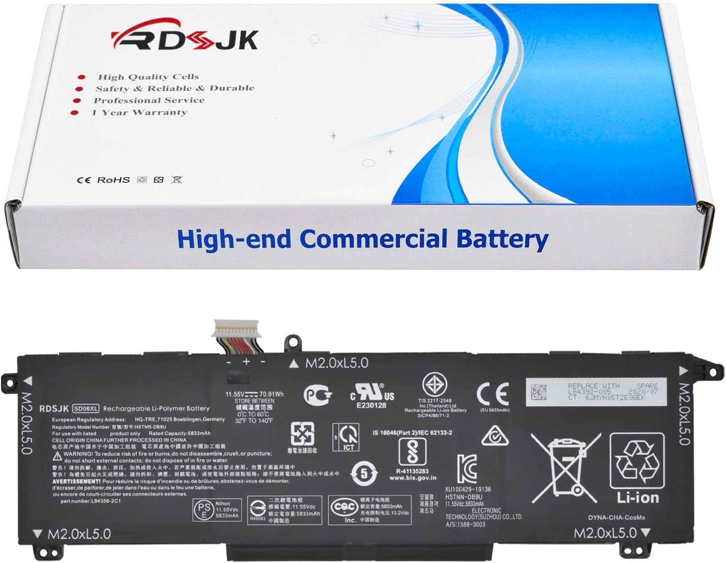 Battery Type: Li-ion; Voltage: 11.55V; Capacity: 70.91Wh/5833mAh; Color: Black Compatible Machine Models: HP Omen 15 2020 15-EK0000 Series 15-EK0008CA 15-EK0010CA 15-EK0018CA 15-EK0020CA 15-EK0013DX 15-EK0023DX 15-ek0025tx 15-EK0003na 15-EK0071ng 15-EK0277ng 15-EK0456ng 15-EK0019NR 15-EK0026NR 15-EK0001TX 15-EK0004TX 15-EK0007TX 15-EK0009TX 15-ek0010TX 15-ek0011TX 15-ek0013TX 15-ek0014TX 15-EK0018TX 15-EK0010TX 15-EK0011TX 15-EK0013TX 15-EK0014TX 15-ek0018TX 15-EK0019TX 15-EK0023TX 15-EK0025tx 15-EK0031TX 15-ek0038TX 15-ek0051TX 15-EK0056TX 15-EK0058TX 15-EK0059TX 15-ek0080TX 15-ek0081TX 15-ek0082TX 15-ek0085TX 15-ek0086TX 15-ek0111TX 15-EK1017TX 15-EK1035TX 15-EK0026NR 15-EK0031TX 15-EK0038TX 15-EK0051TX HP Omen 15-EN 15-EN0000 Series 15-EN0002AX 15-EN0002LA 15-EN0007AX 15-EN0010CA 15-EN0013AX 15-EN0013DX 15-EN0014AX 15-EN0023AX 15-EN0023DX 15-EN0024AX 15-EN0025AX 15-EN0026AX 15-EN0029NR 15-EN0036AX 15-EN0036NR Compatible Part Numbers: SD06XL HSTNN-089U HSTNN-DB9U HSTNN-OB1R L84356-2C1 L84357-AC1L84392-005 L84394-005 LB4392-005 L84392-006 SDO6XL SD06070XL SD06080XL SD06 SDO6 3ICP4/66/71-2 Note: Please check if this battery is compatible with your computer before purchasing. If you are not sure for that, please contact us!