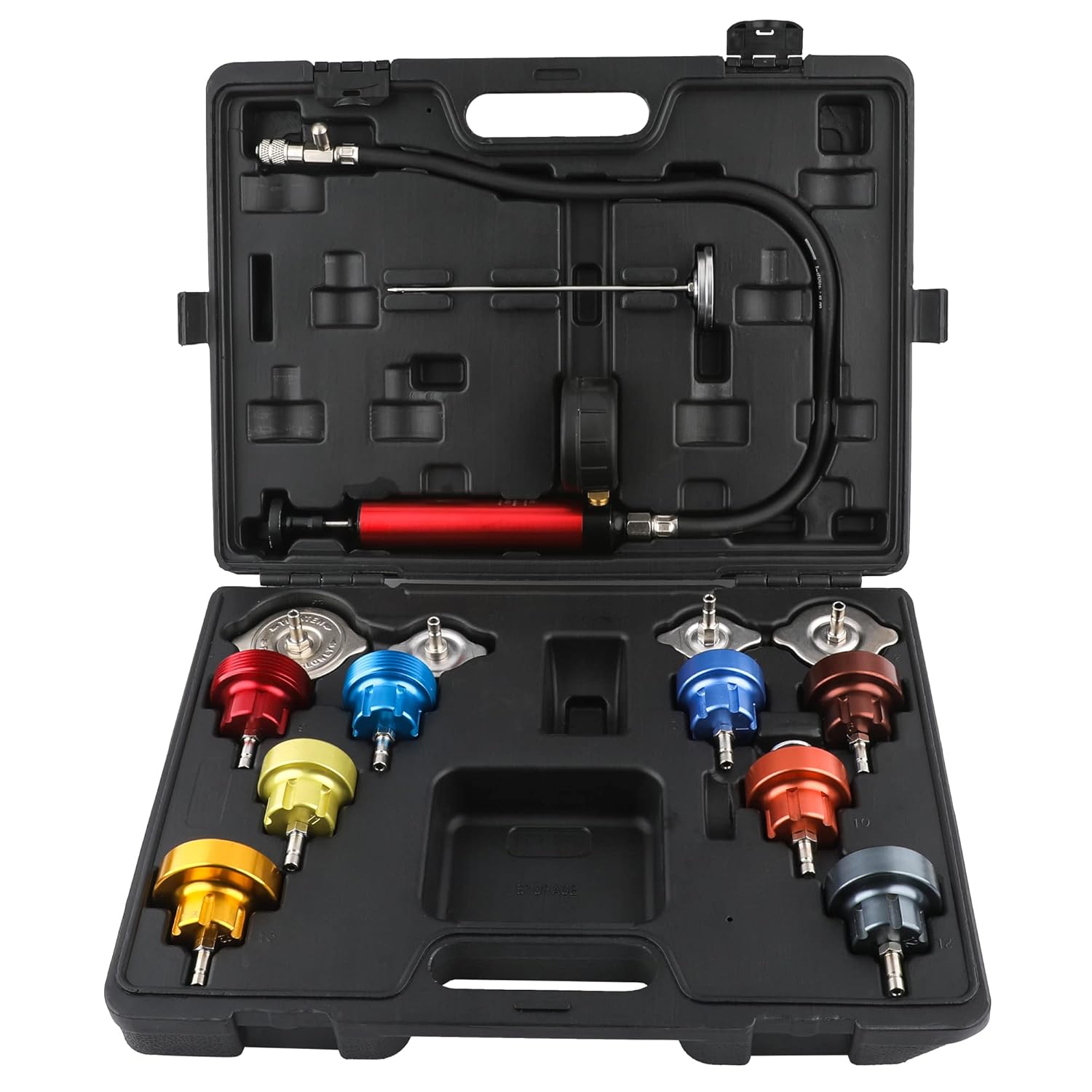 Super Stars 14 piezas Kit de probador de presión de refrigerante de aluminio, probador de presión de radiador con bomba manual y adaptadores que funcionan en la prueba de fugas del sistema de refrigeración, herramientas automotrices