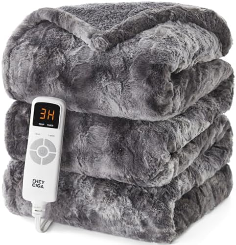 EHEYCIGA Electric Heated Blanket Throw Faux Fur, 10 Hours Auto Shut Off 9 Heating Levels Heating Blanket Throw, Soft Warm Heated Blanket Fast Heating, Faux Fur & Sherpa