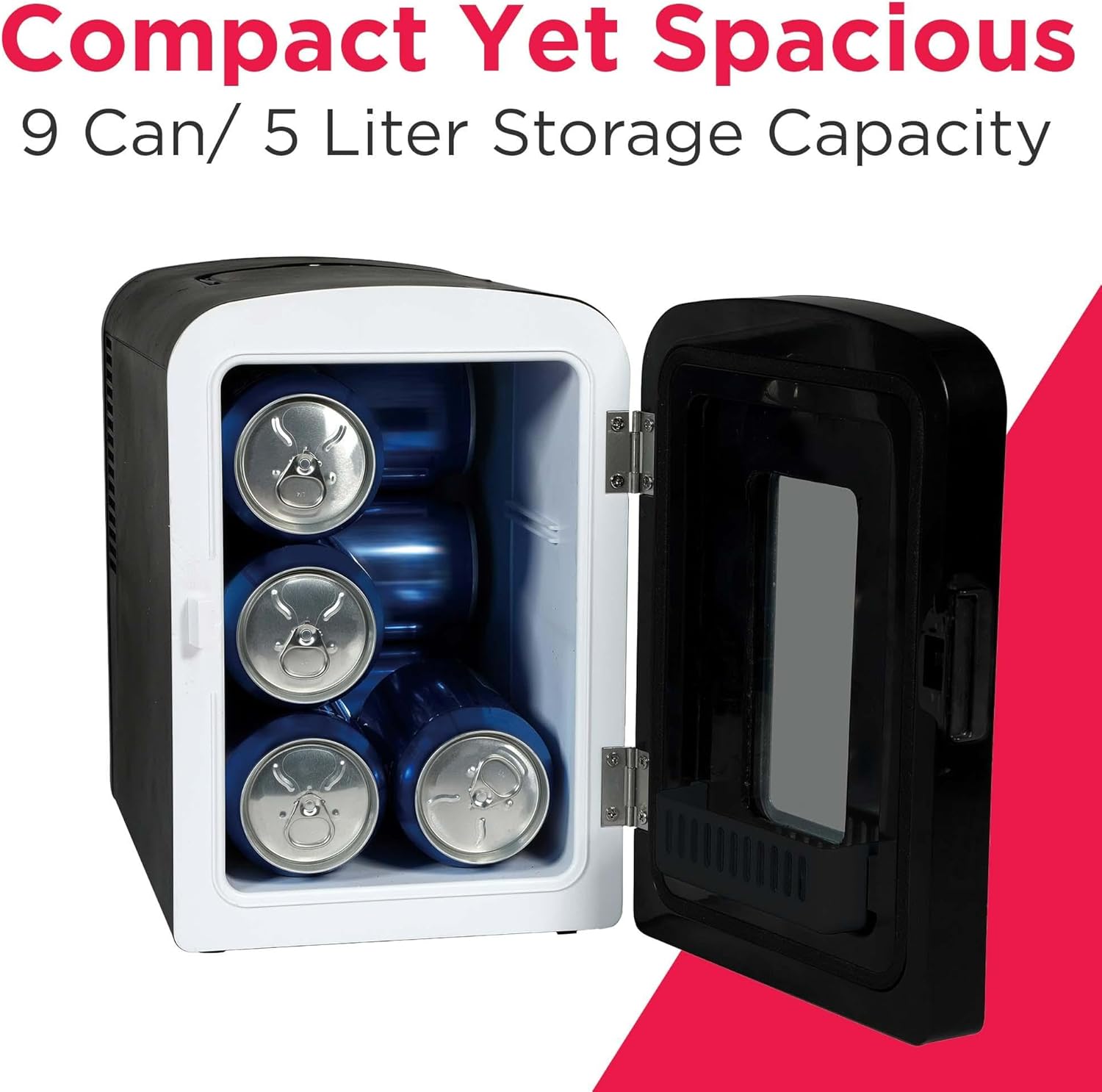 CAPACIDAD/RECURSOS: almacena hasta 9 latas. Alimentado por una toma de pared de 110 V (AC). Se enfría hasta 20 grados F por debajo de la temperatura ambiente. Se conecta a varios enchufes.