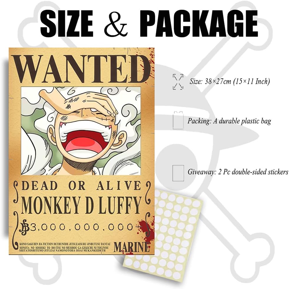 Quantity: A set of 11 PCS[OP] Wanted Posters, Updated Bounty Nika Luffy 3 Billion, Zoro, Sanji, 2PCS double-sided stickers, overall colors and figures are consistent with one piece wanted notice in original animation, and do our best to give fans of One Piece Manga a wonderful collection.