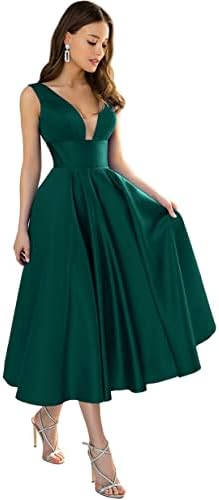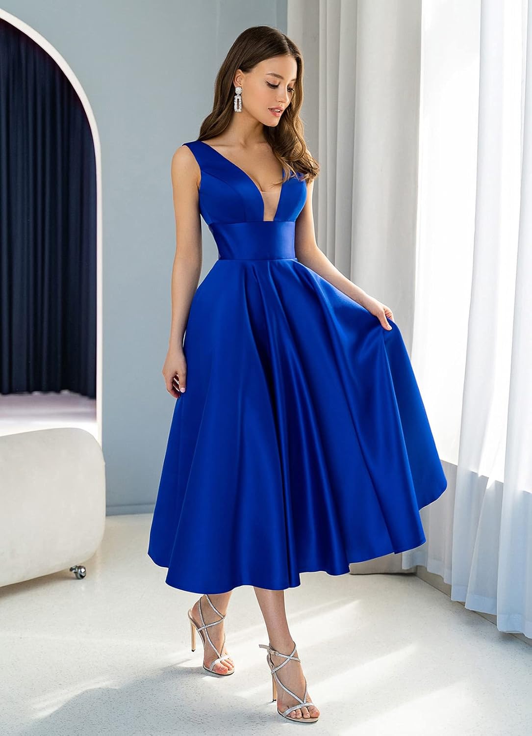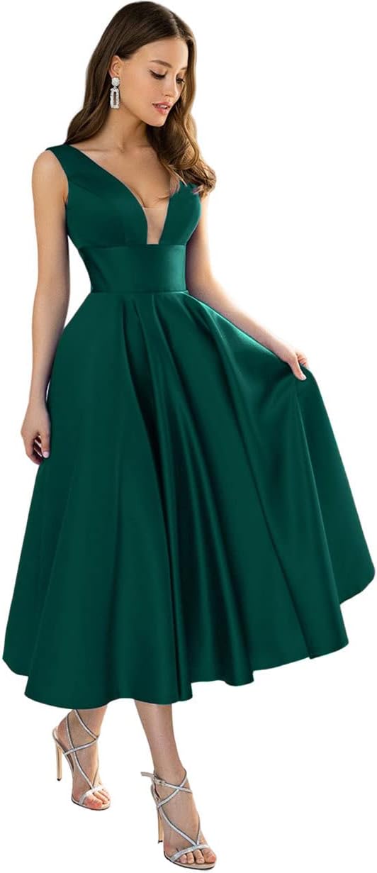 Women's Satin Bridesmaid Dresses Short V-Neck Tea Length Formal Gowns A-line Evening Dress with Pockets