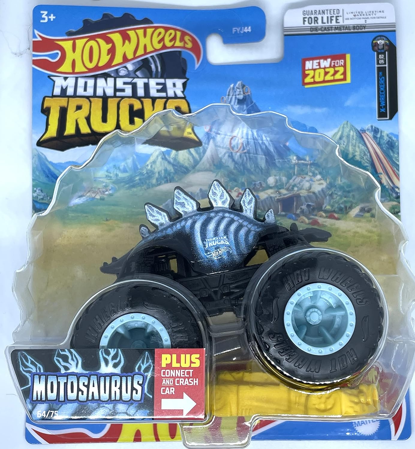 DieCast Hot Wheels Monster Trucks Motosaurus 64/75 (Negro/Azul), Camión a escala 1:64 con carro Connect and Crash