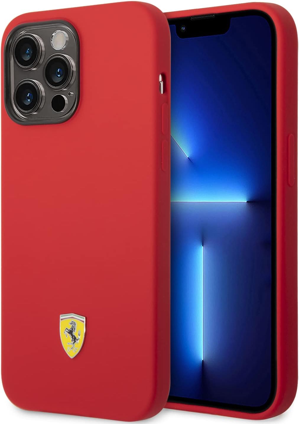 Funda para móvil Ferrari de CG MOBILE para iPhone 14 Pro Max en rojo con contorno de cámara negro, funda protectora de silicona líquida suave y antiarañazos con fácil enganche, absorción de impactos y logotipo característico