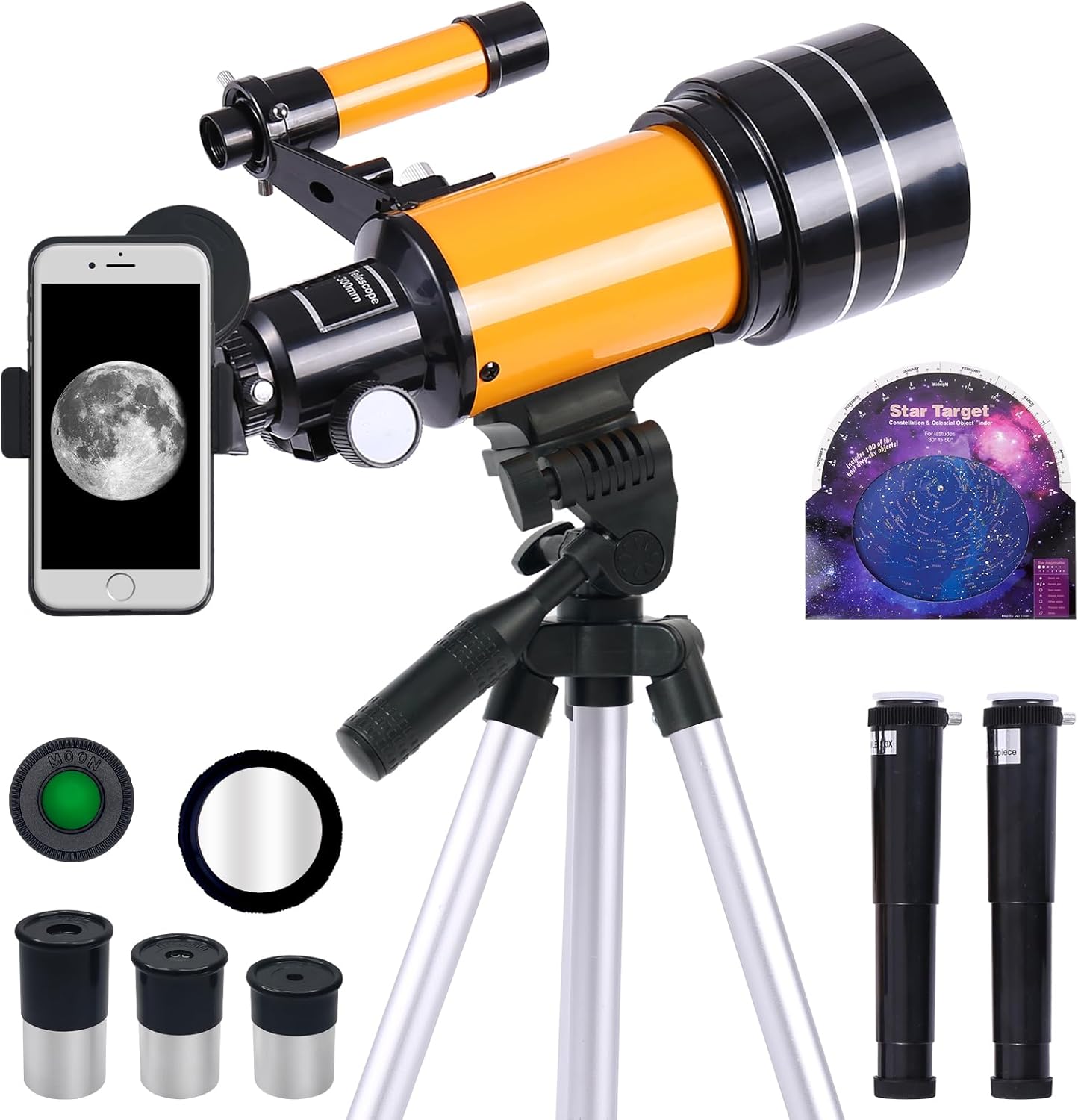 Telescopio para Adultos y Niños, Telescopio Refractor de Astronomía Profesional de 70mm de Abertura para Principiantes, Telescopio Refractor Portátil de 300mm con Montura AZ y Adaptador para Teléfono (Naranja)